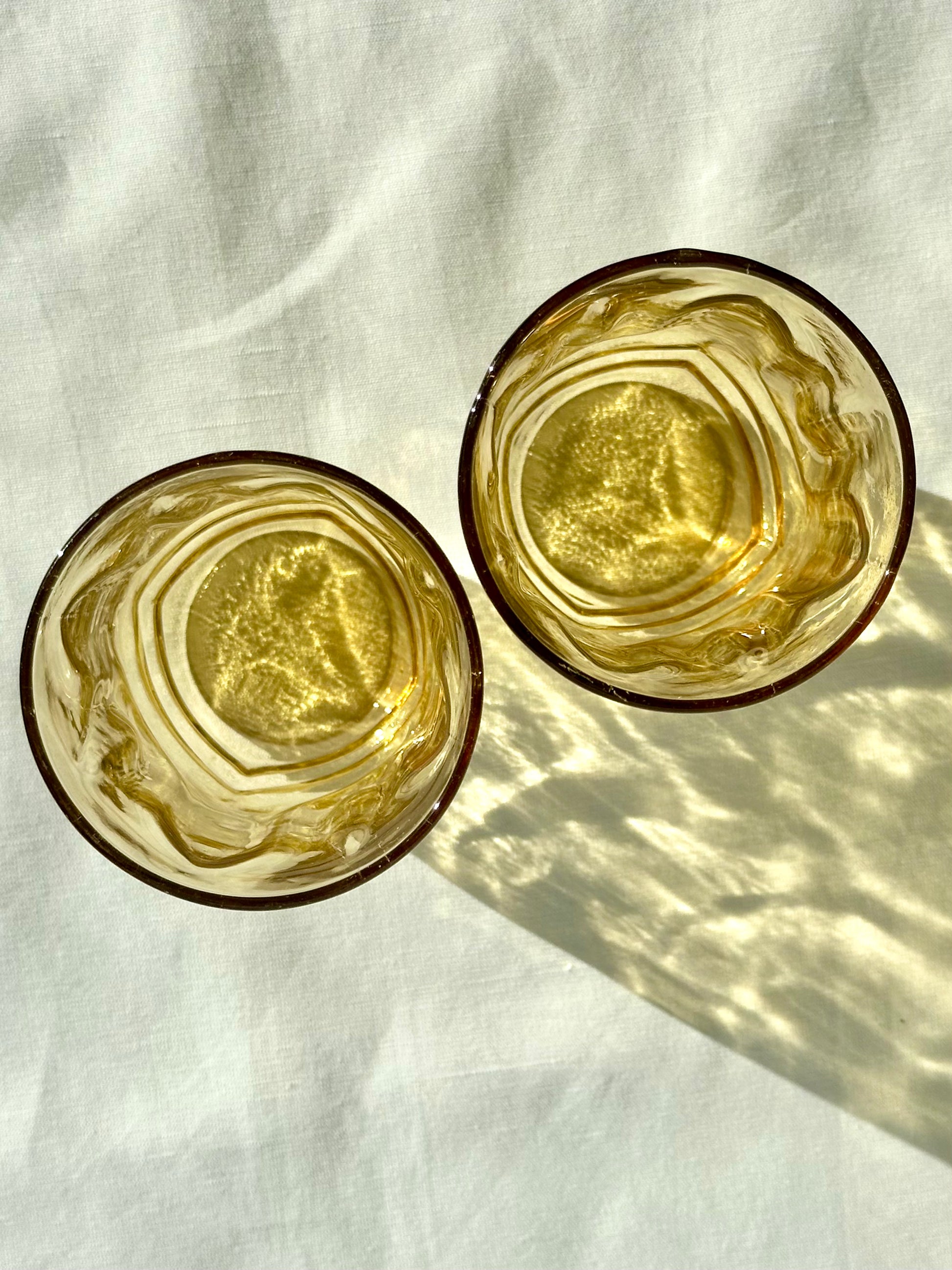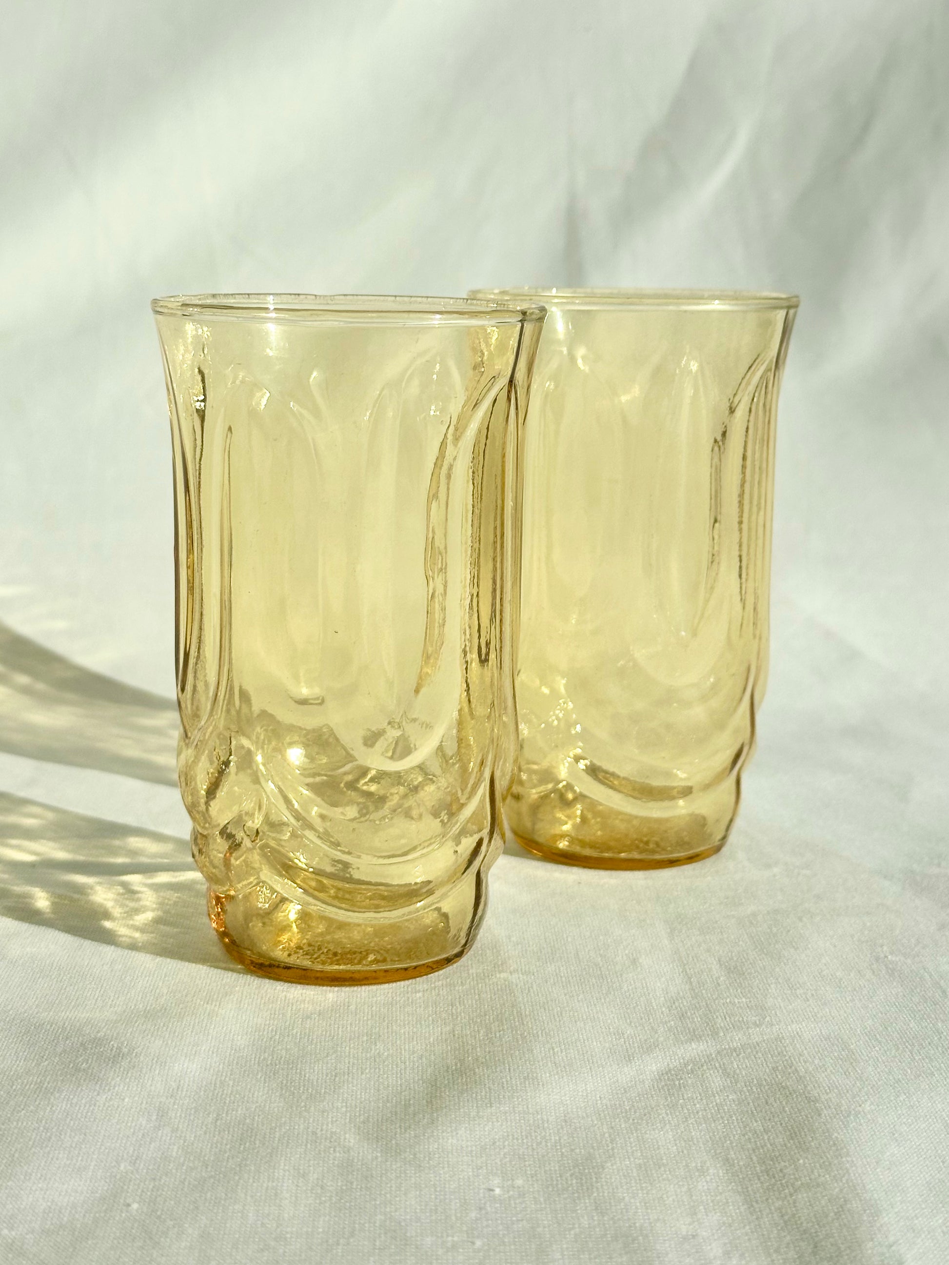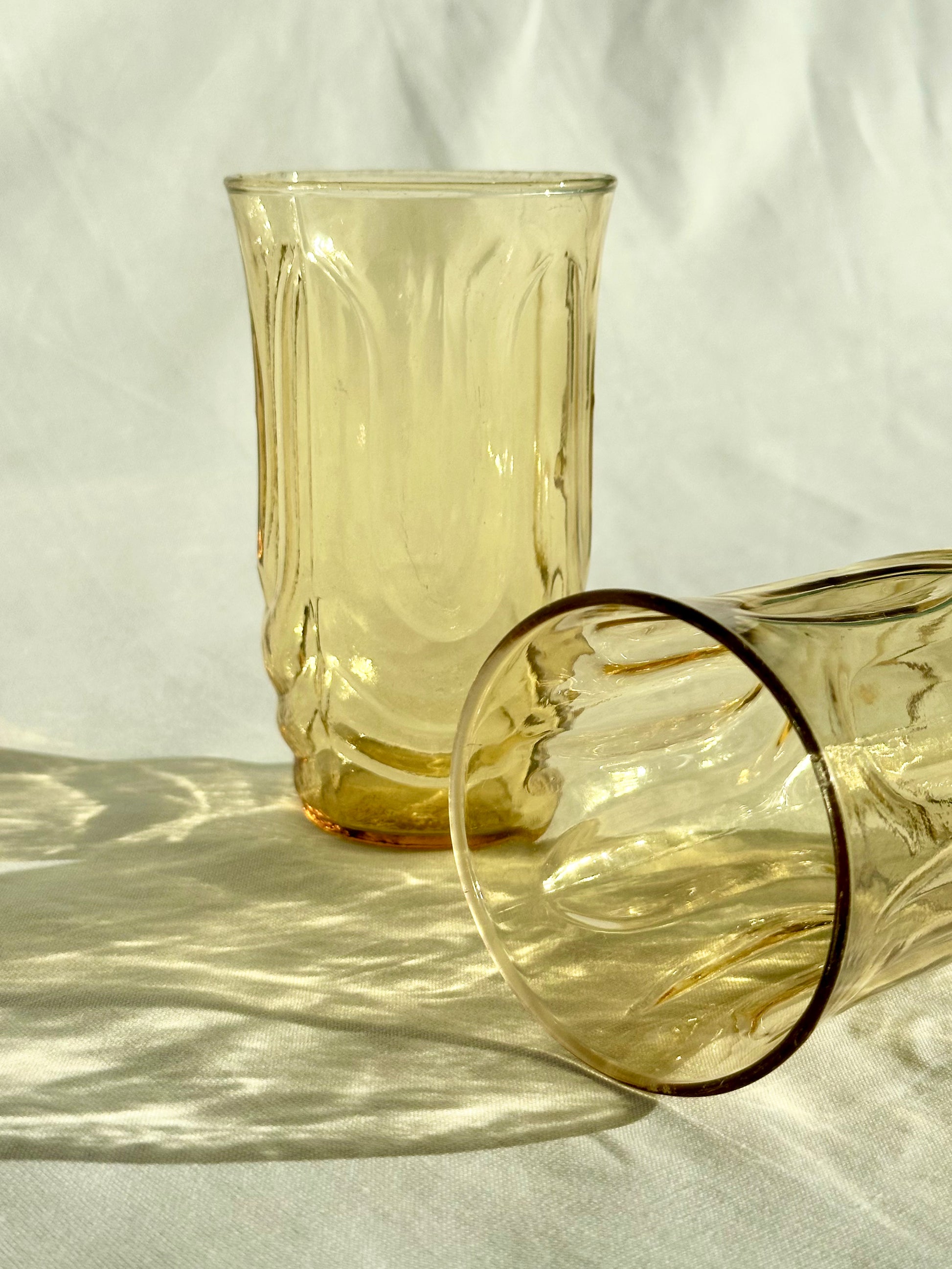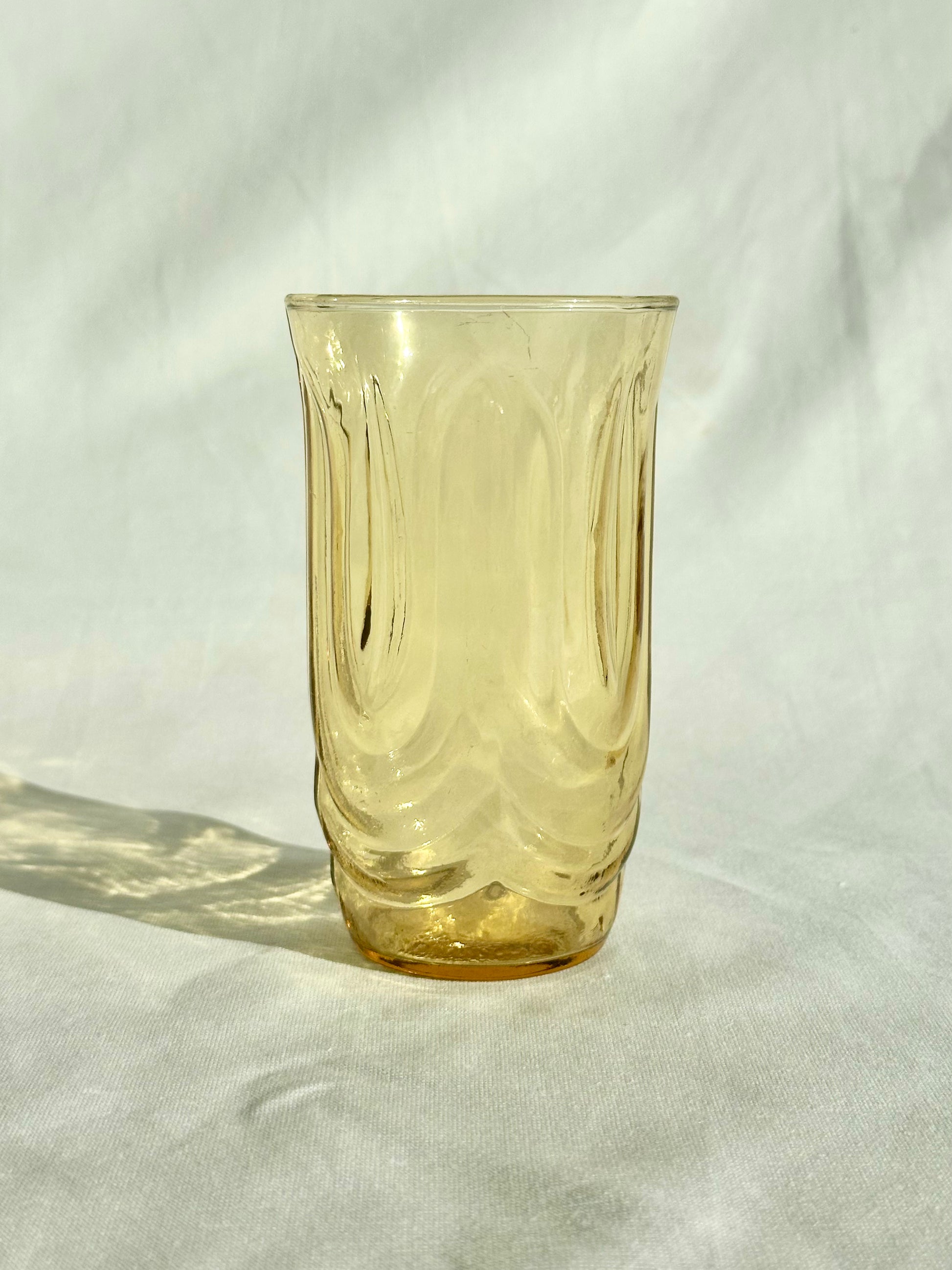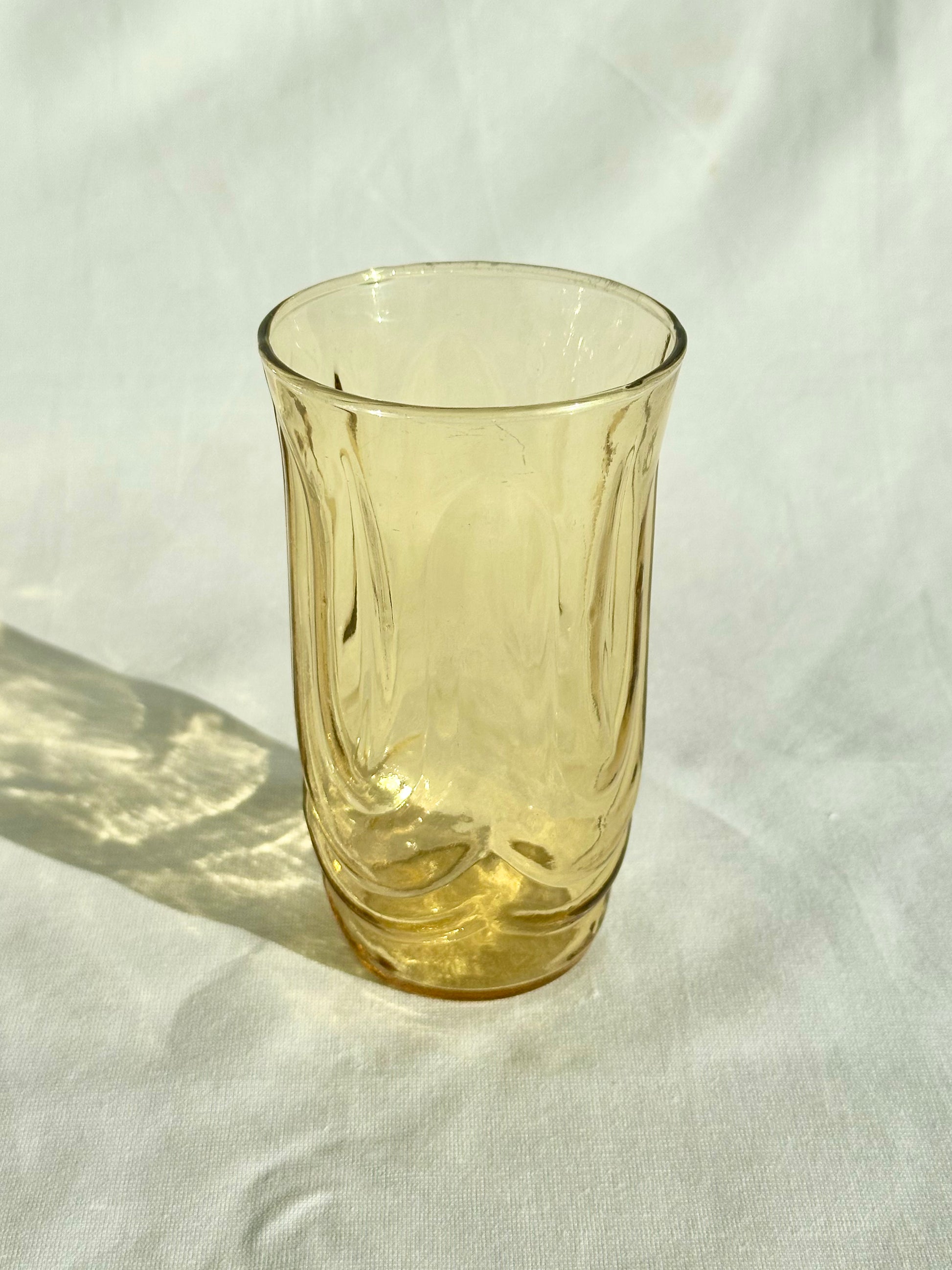 This retro pressed glass amber golden tumbler with tulip shape was made by Anchor Hocking in the 1970s in the USA.