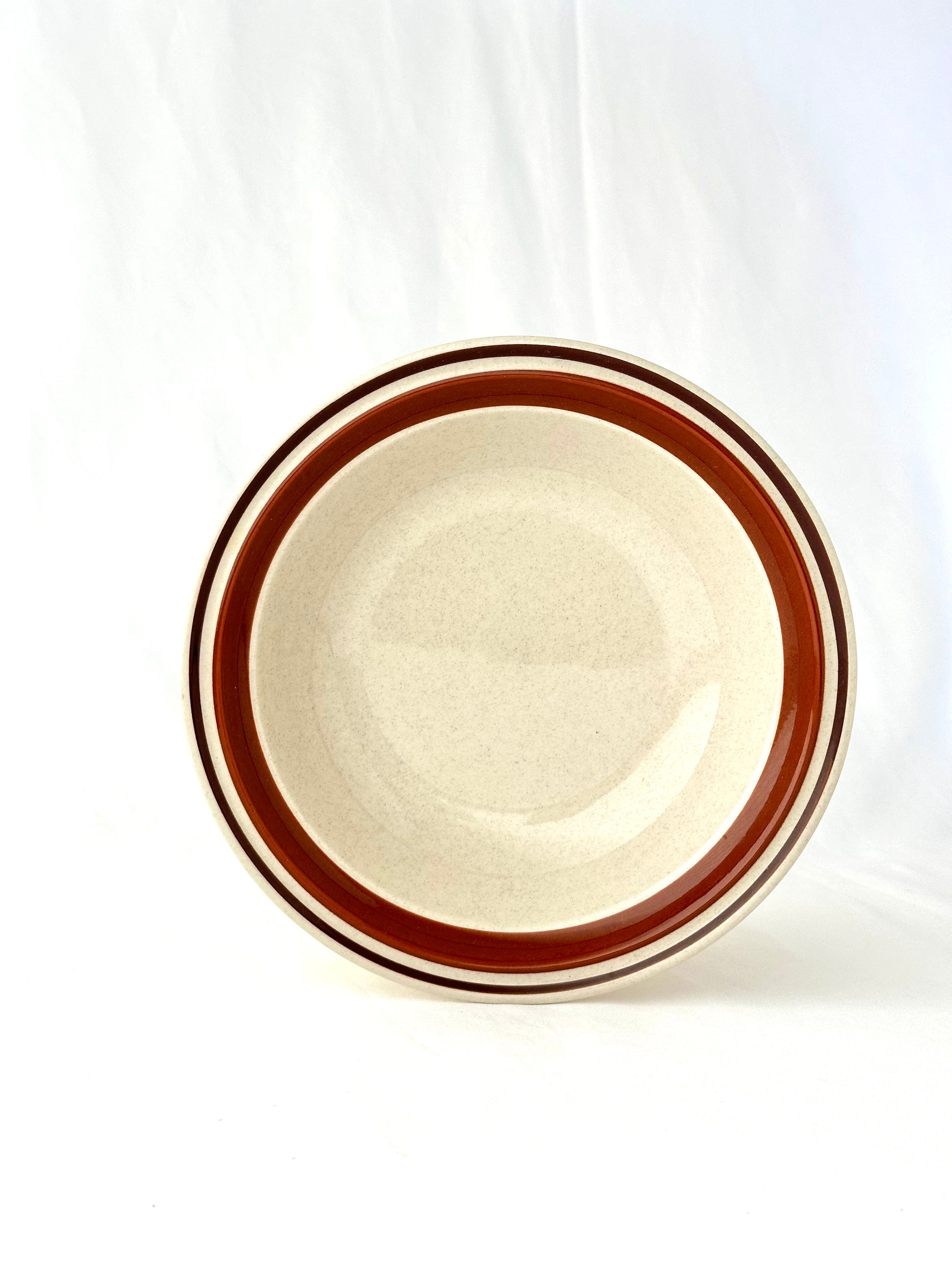 A classic vintage restaurant bowl with double brown stripe detail. A winning choice for serving both decadent and simple fair. Excellent condition. Sold individually.