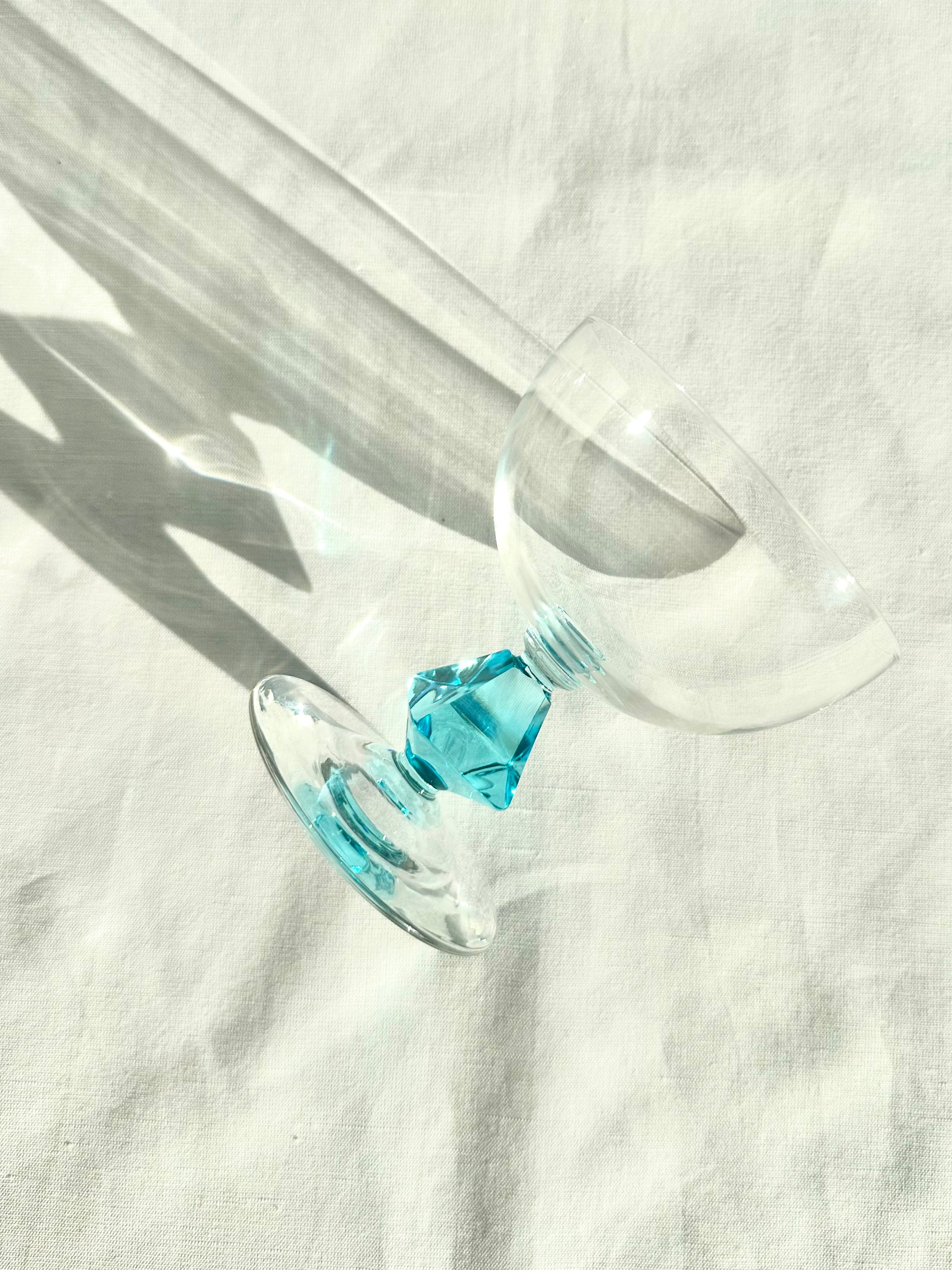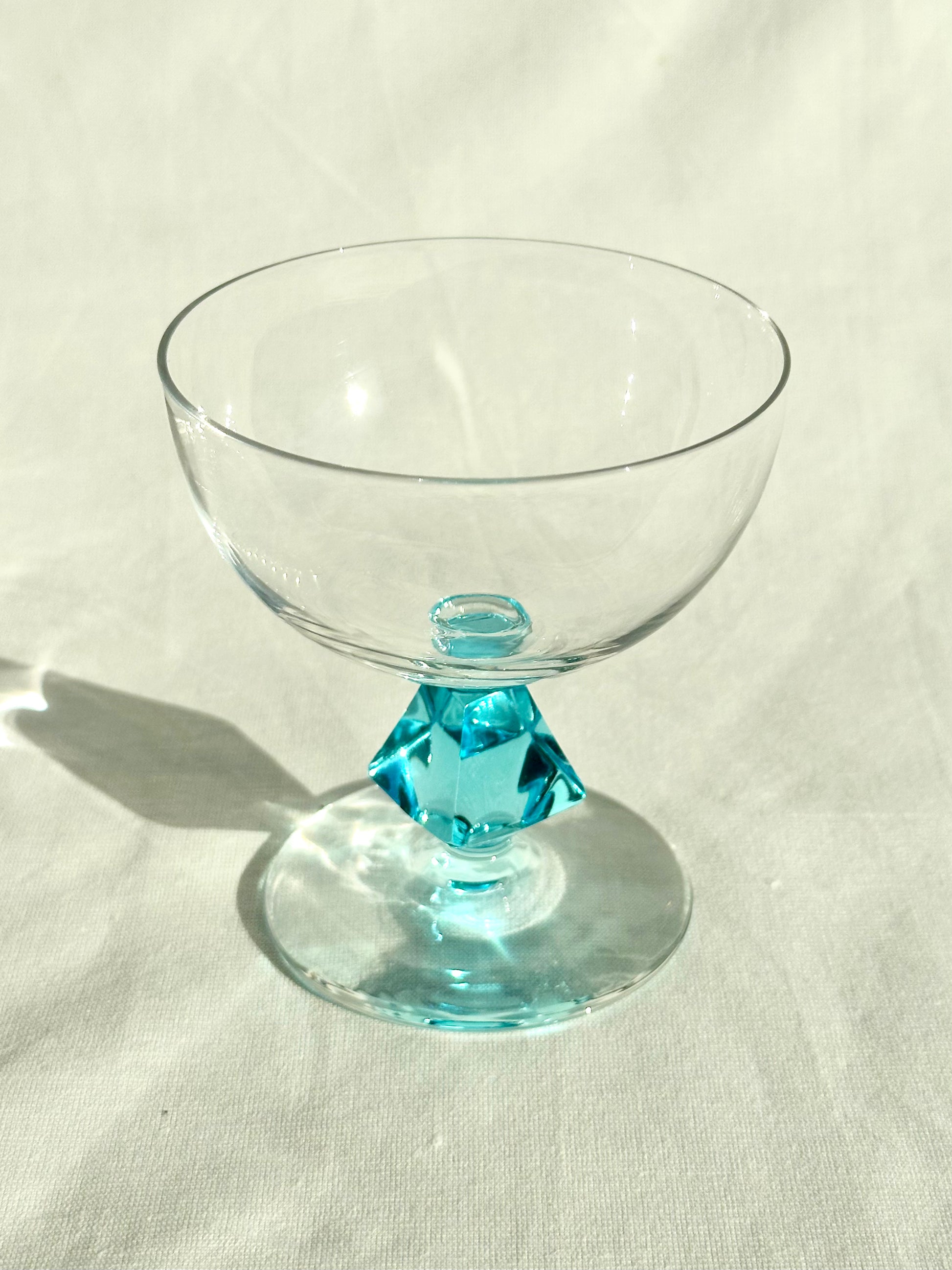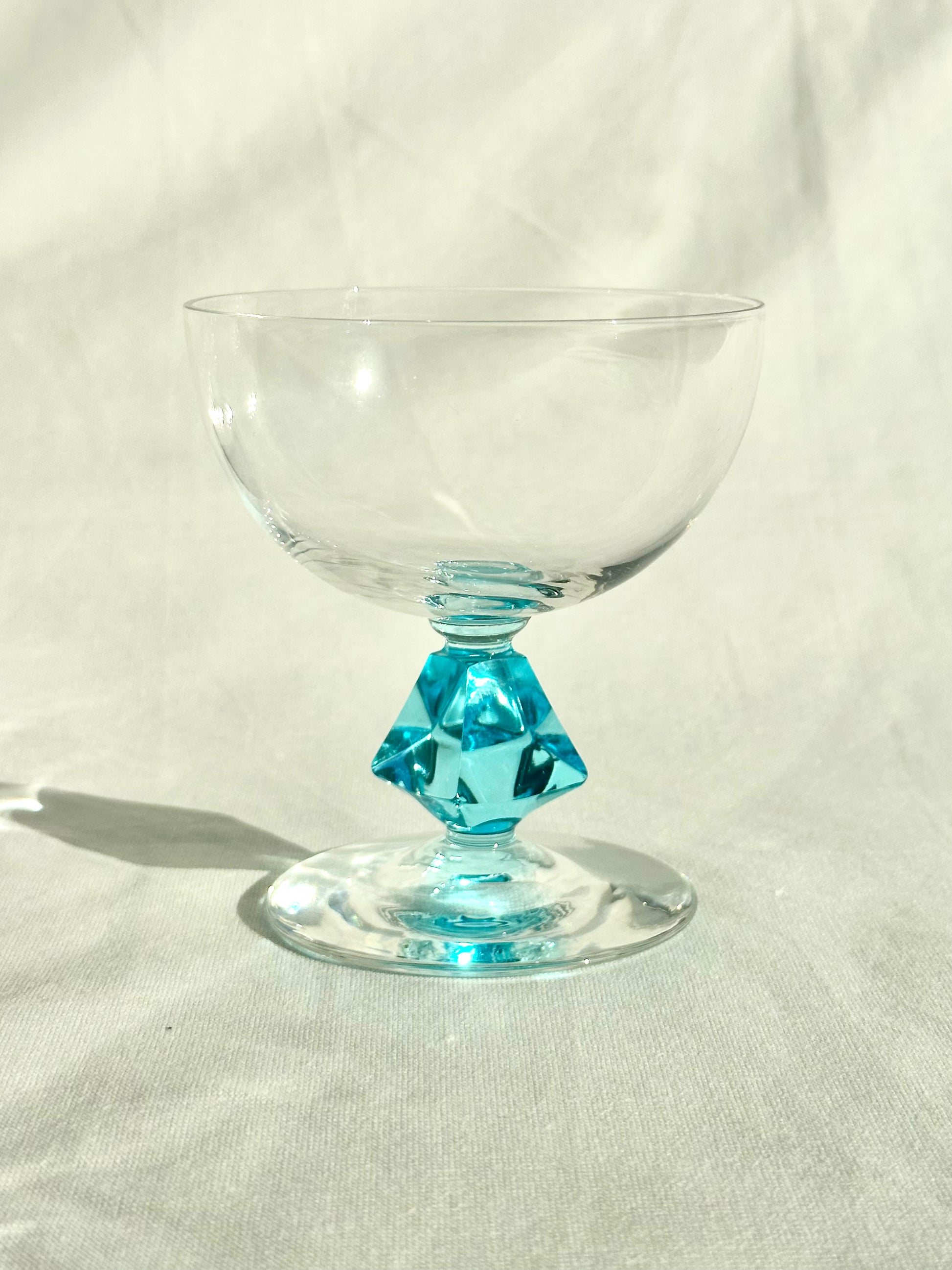 This sparkling vintage cerulean blue Aquarius champagne coupe with diamond stem by Bryce Glass is certain to lift moods as it refracts rays of light with every sip. Sold individually.
