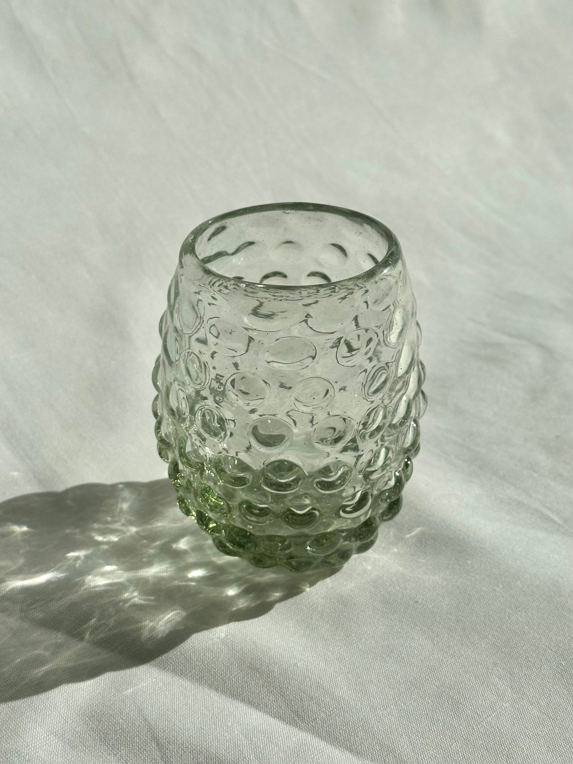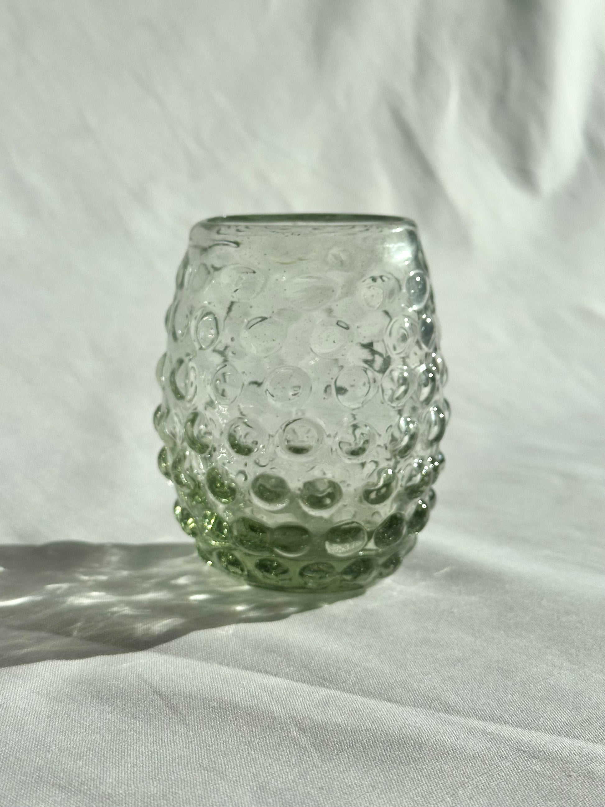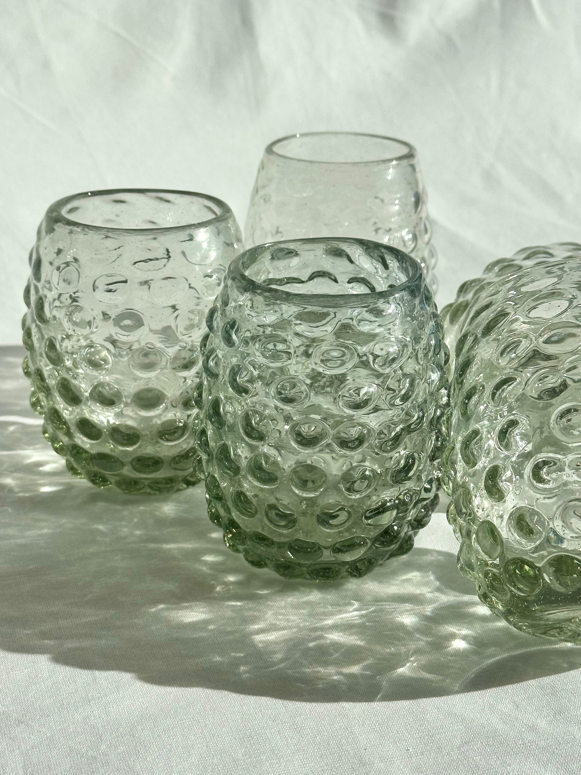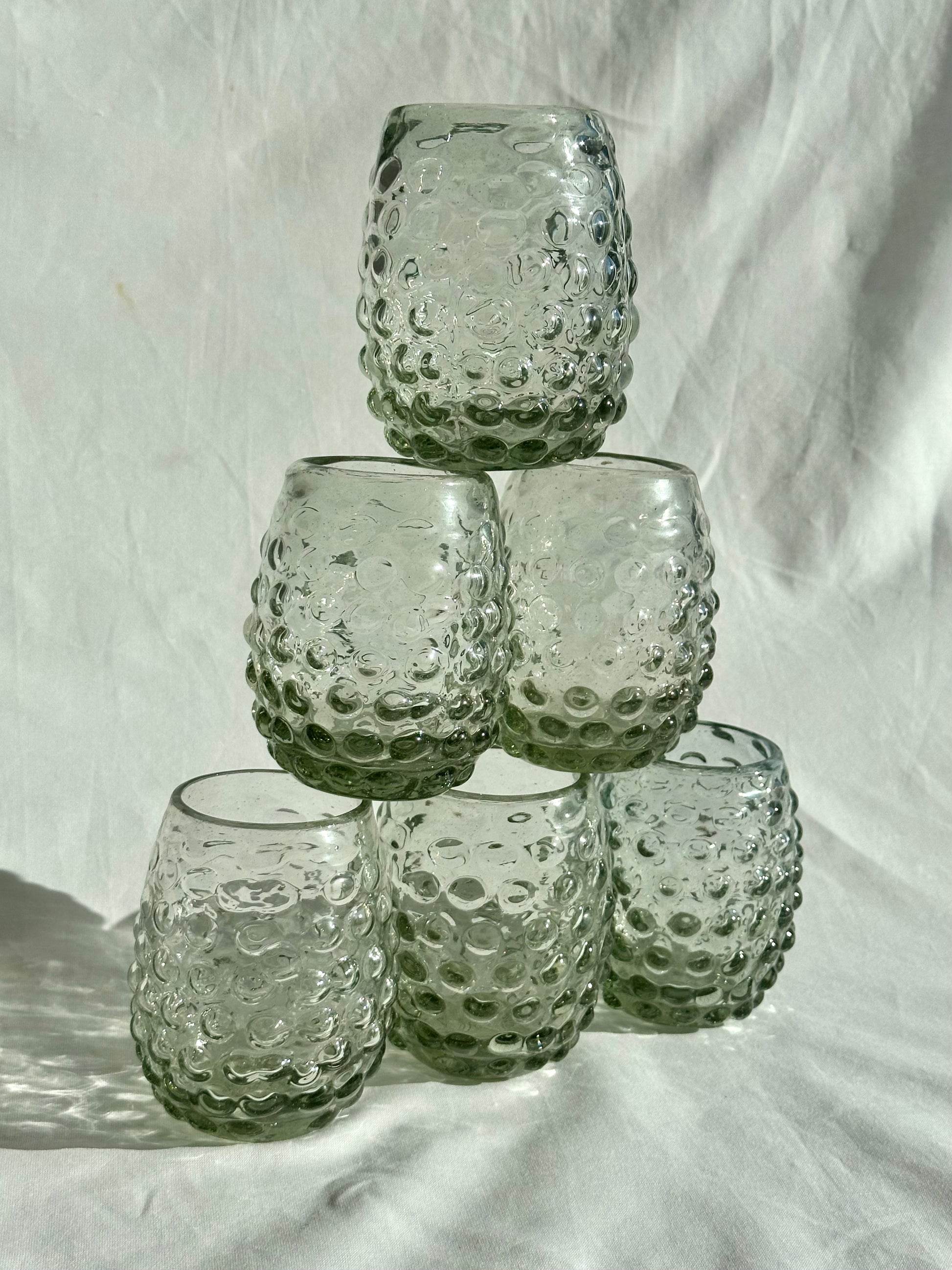 Hand blown tumblers with bubble pattern made in Guadalajara, Mexico from recycled glass. Perfect for mocktails, juice, wine, and water.