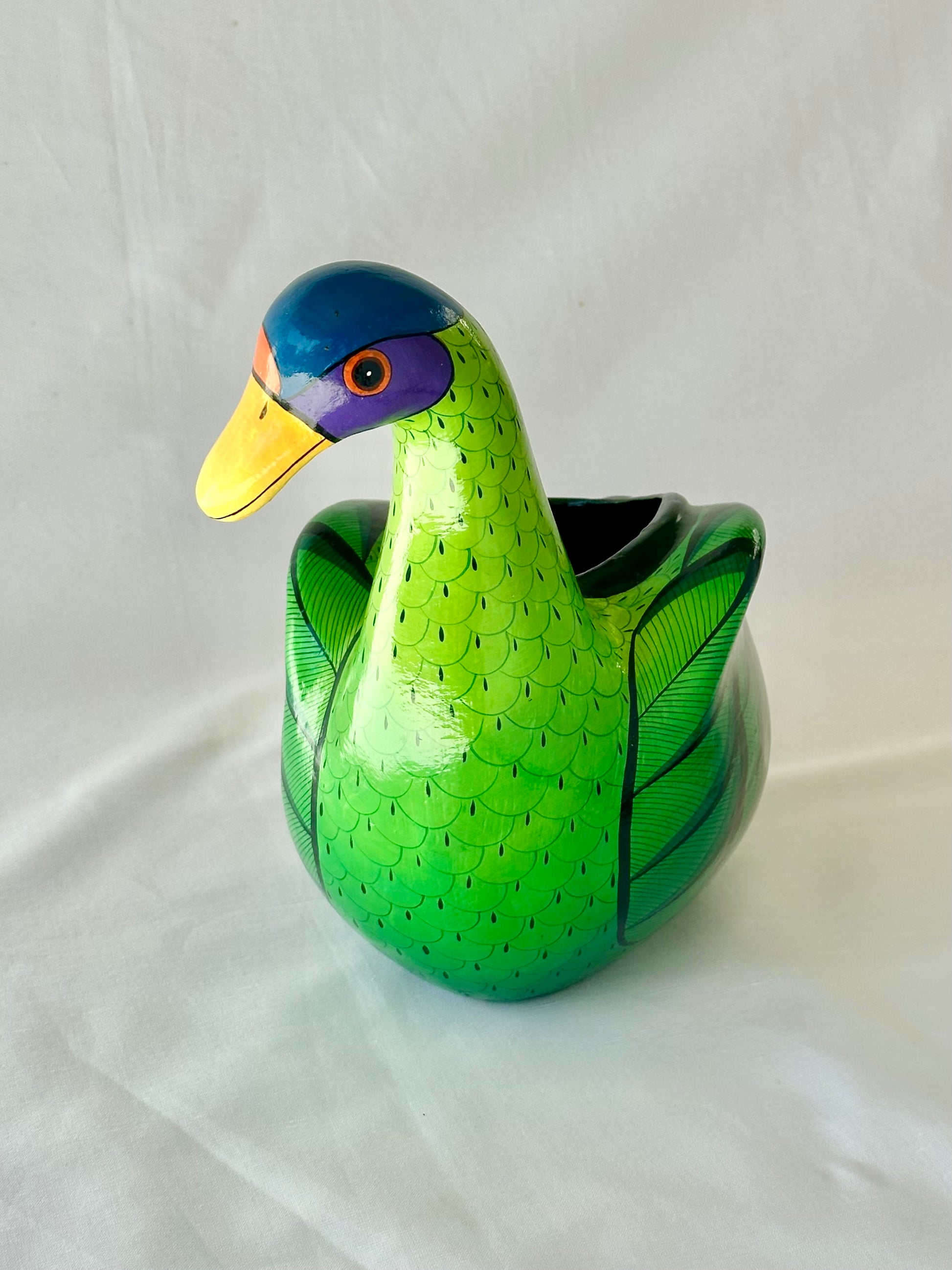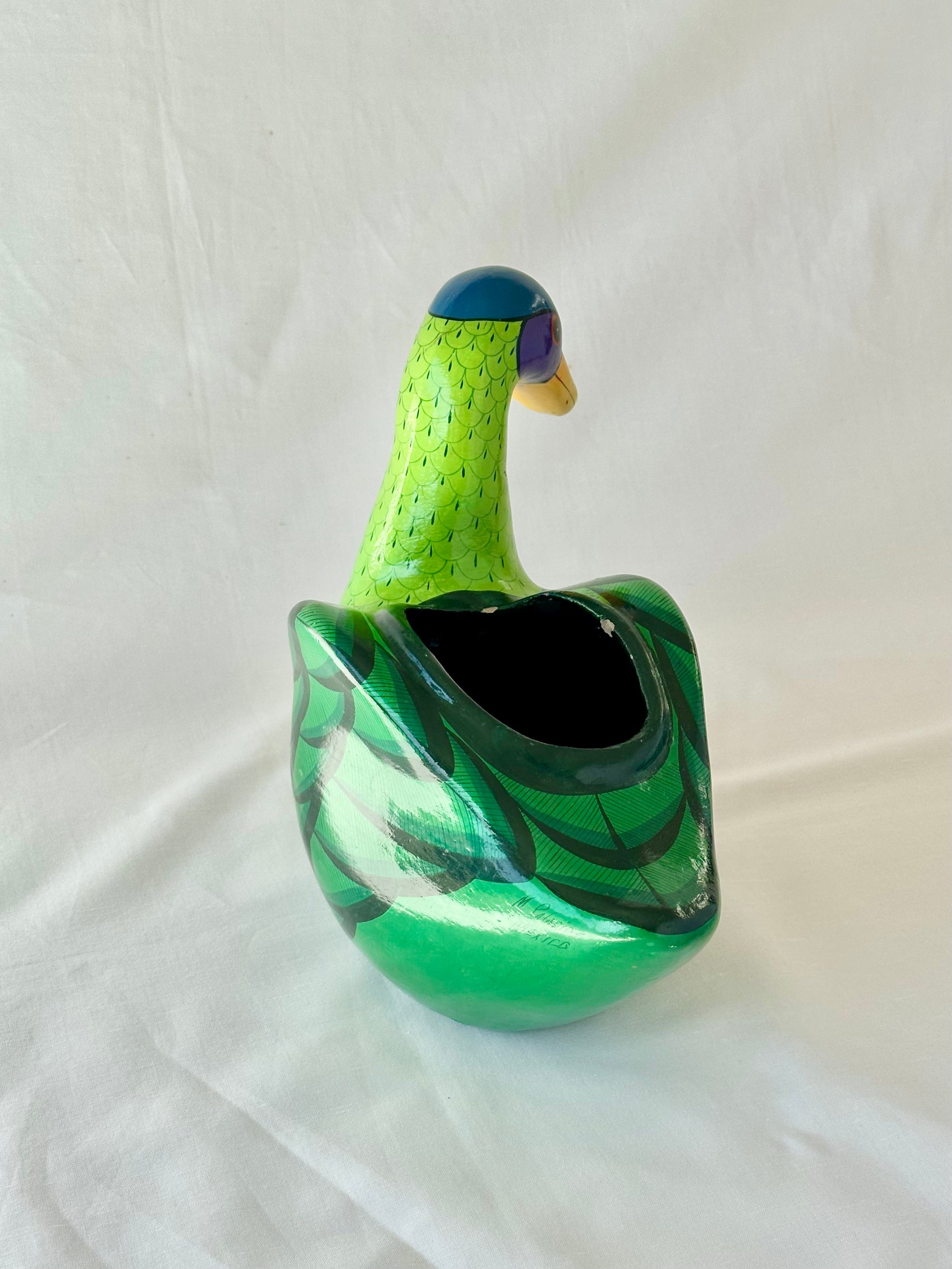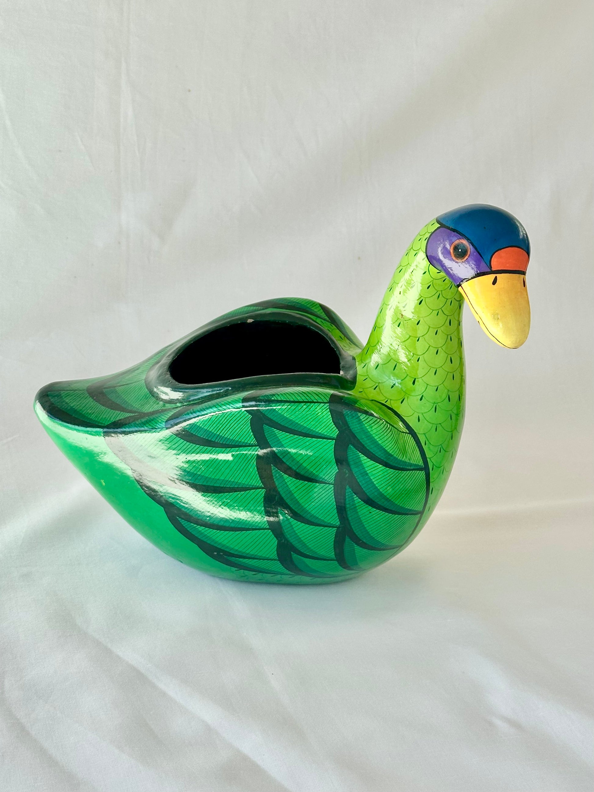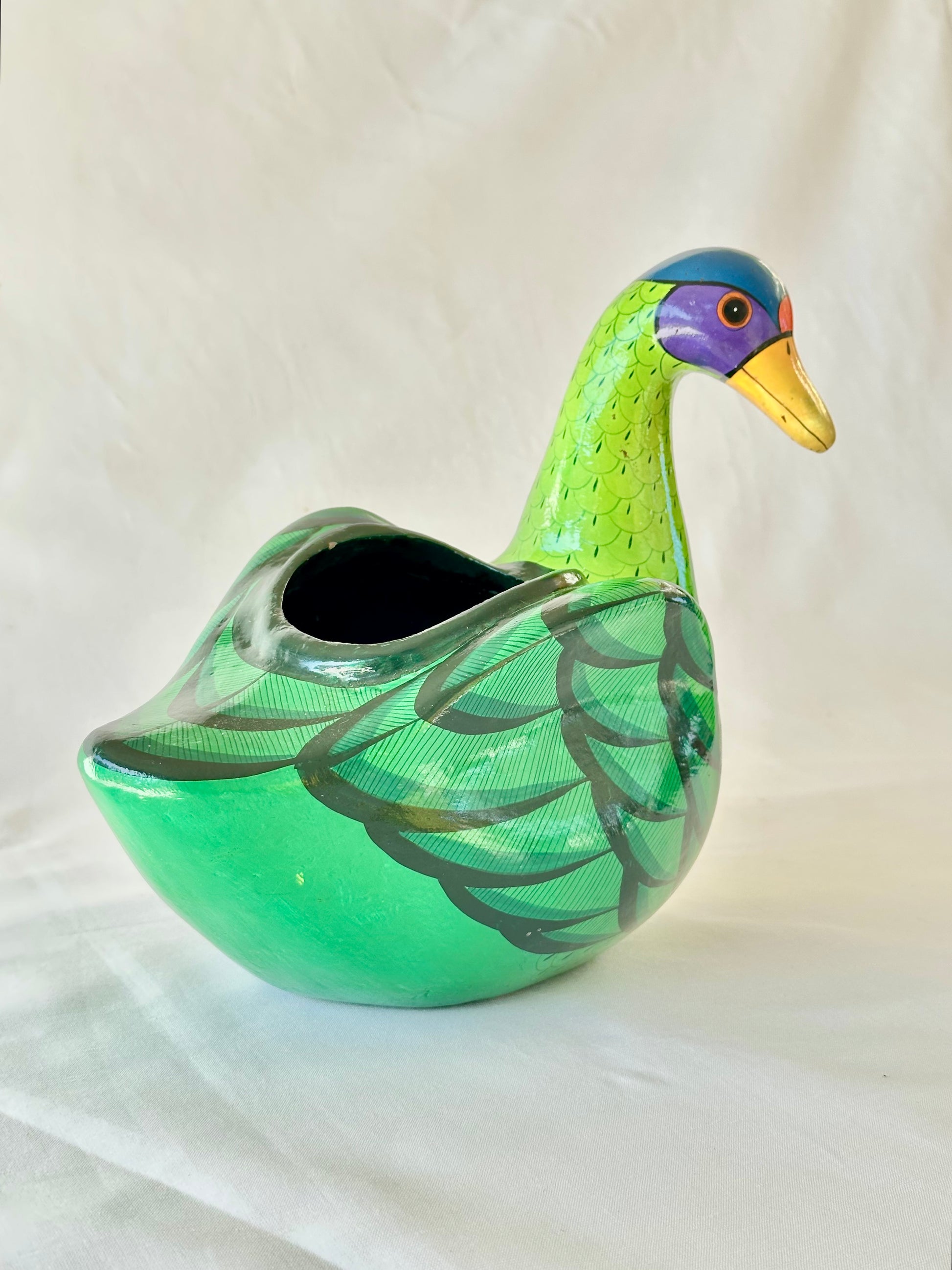 Unique handmade and hand painted 1960s duck folk art ceramic planter by artist M. Palacios.