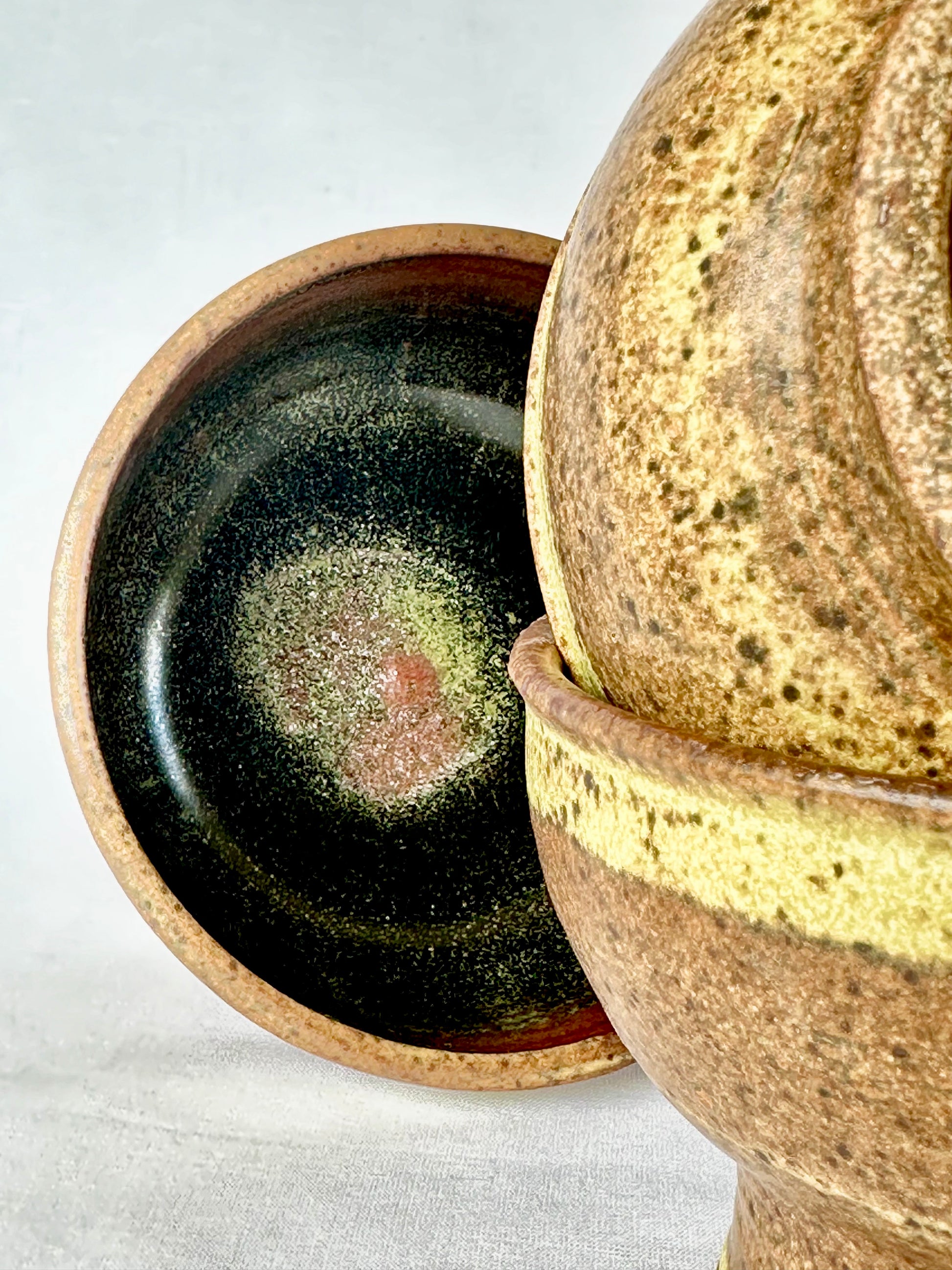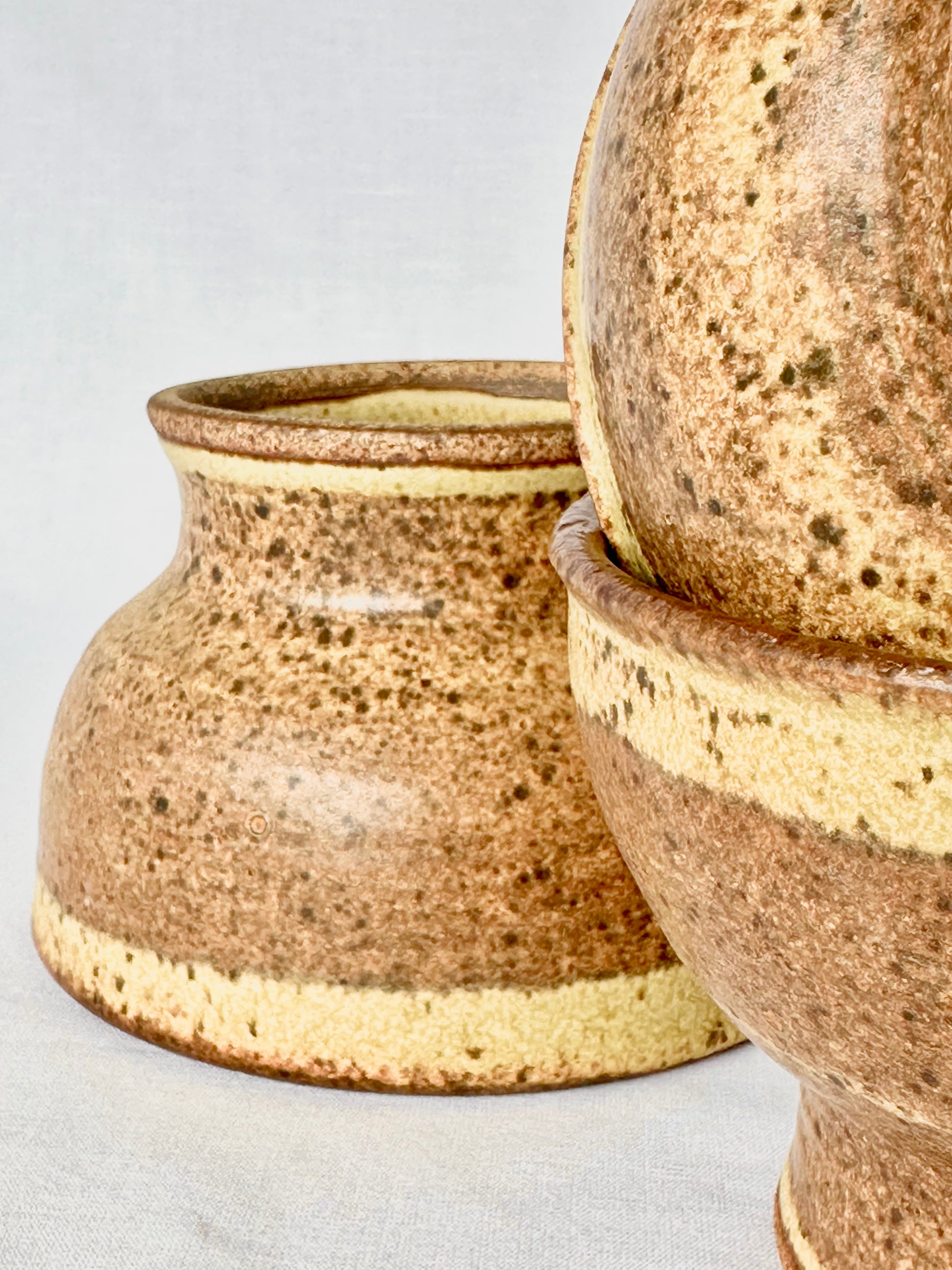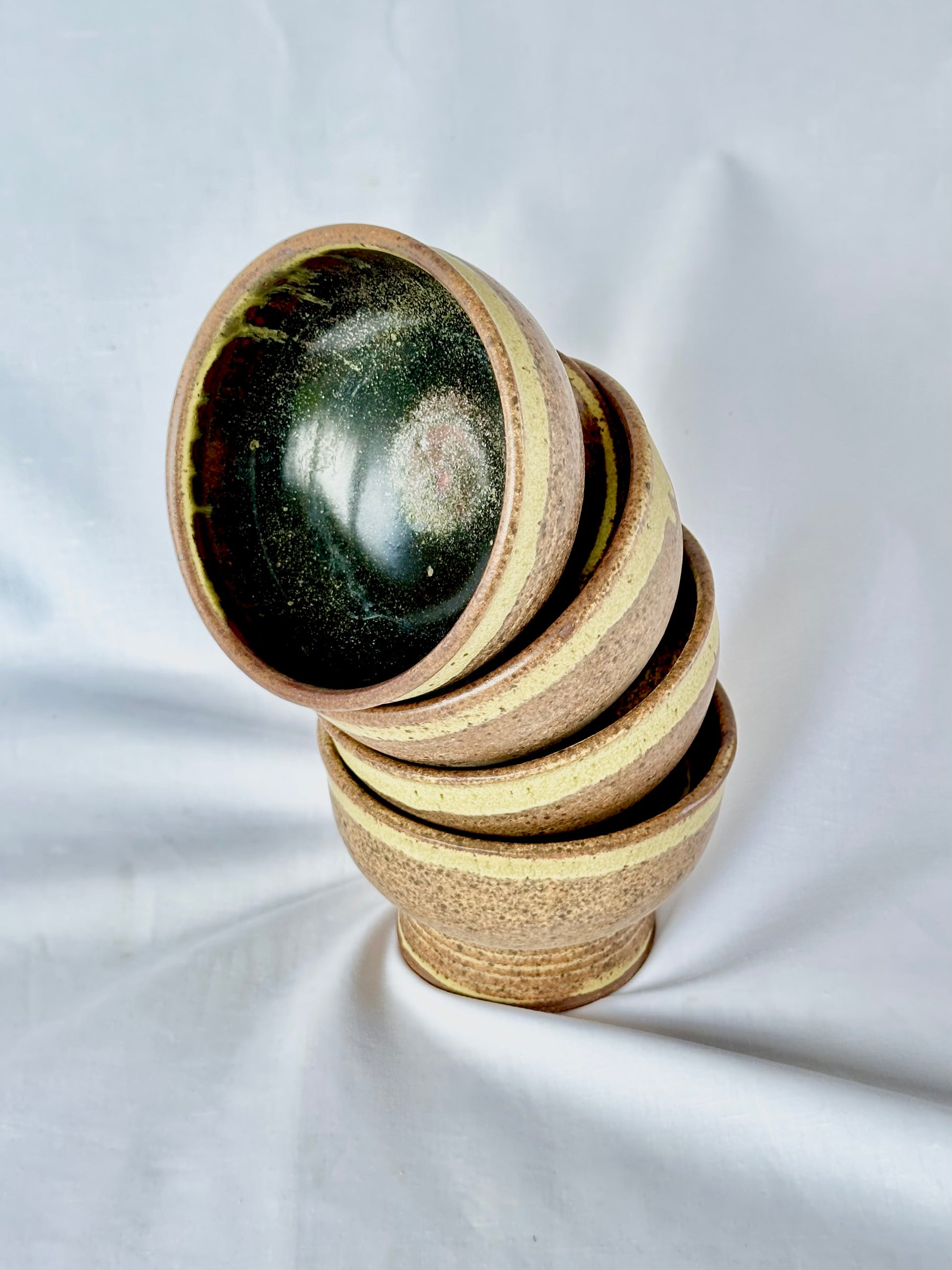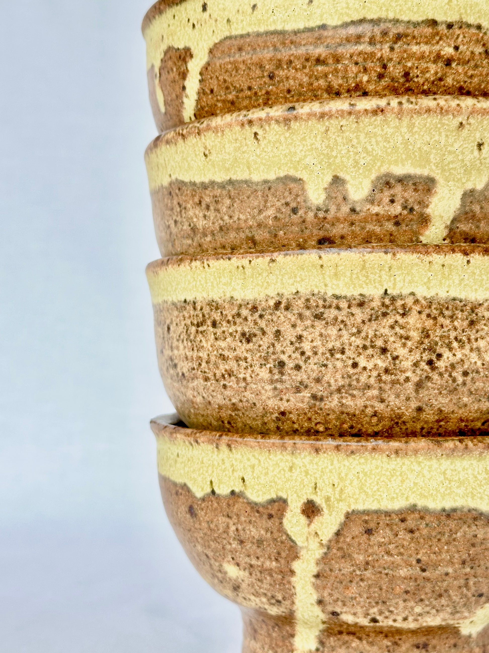 Beautiful 1950s vintage handmade ceramic footed bowls glazed with earthy tones. Sold individually.