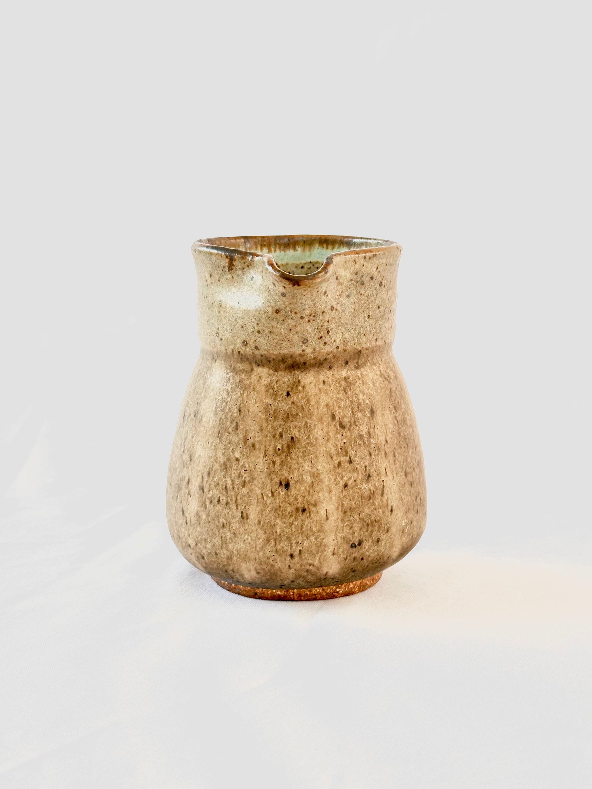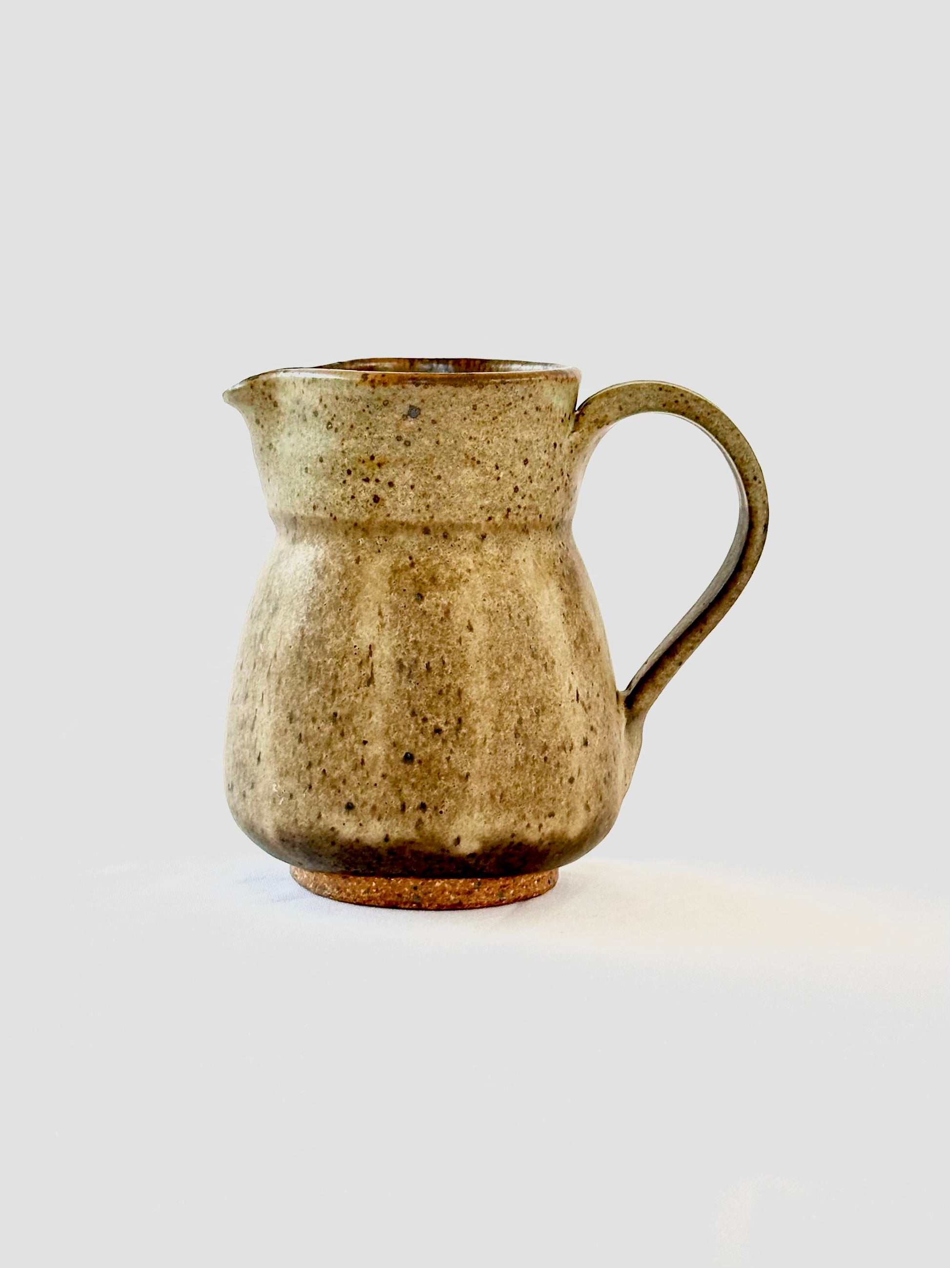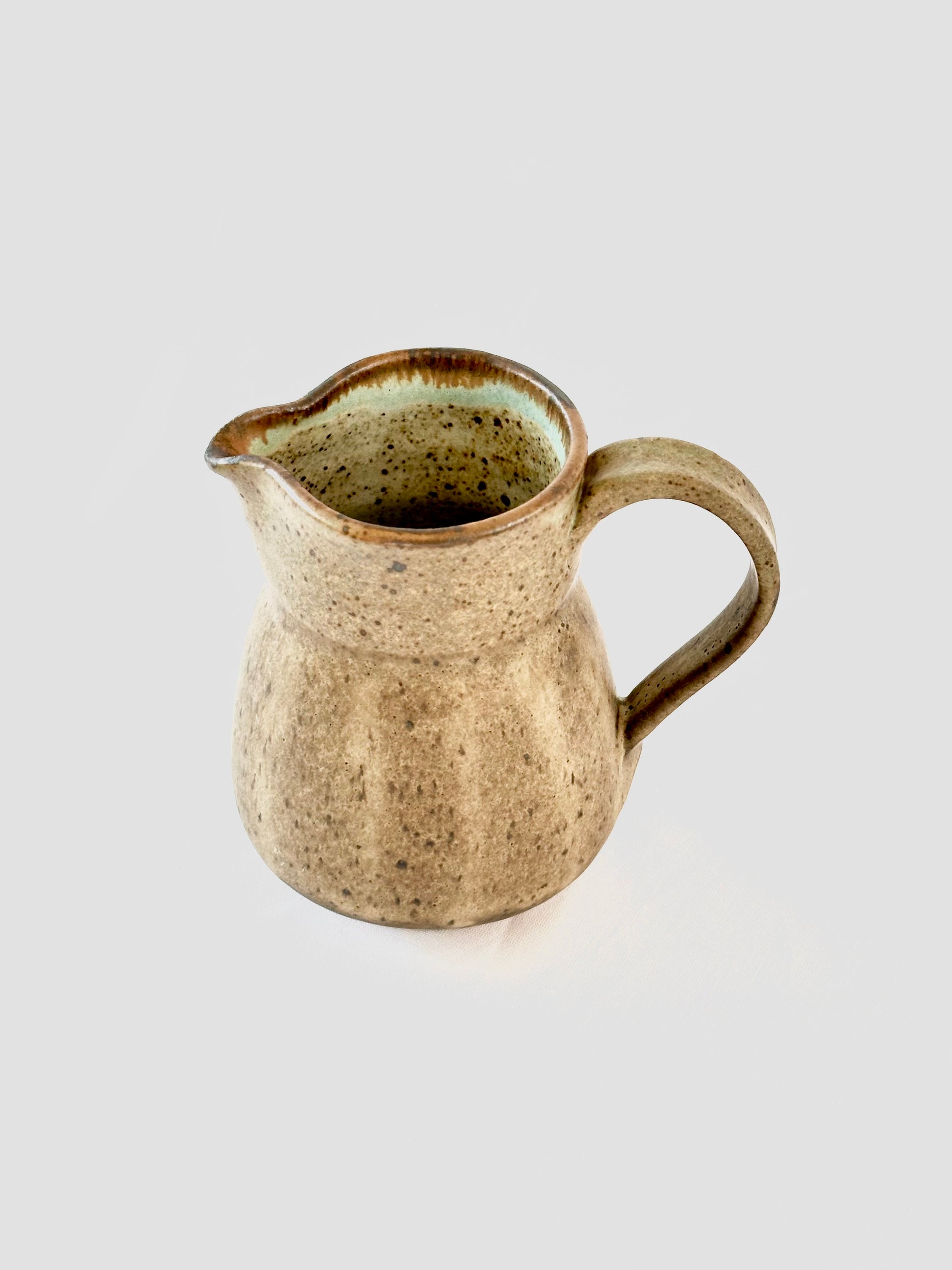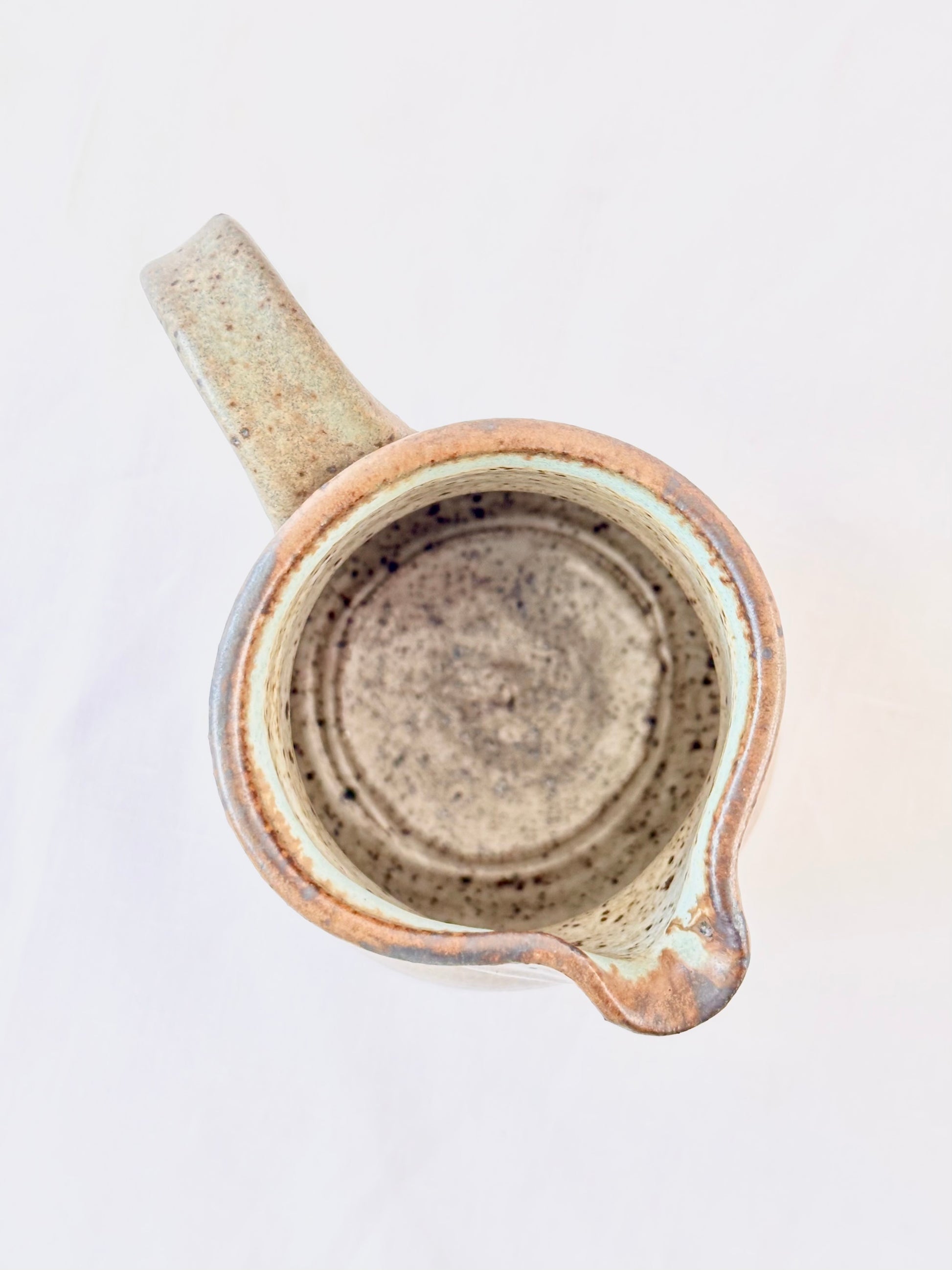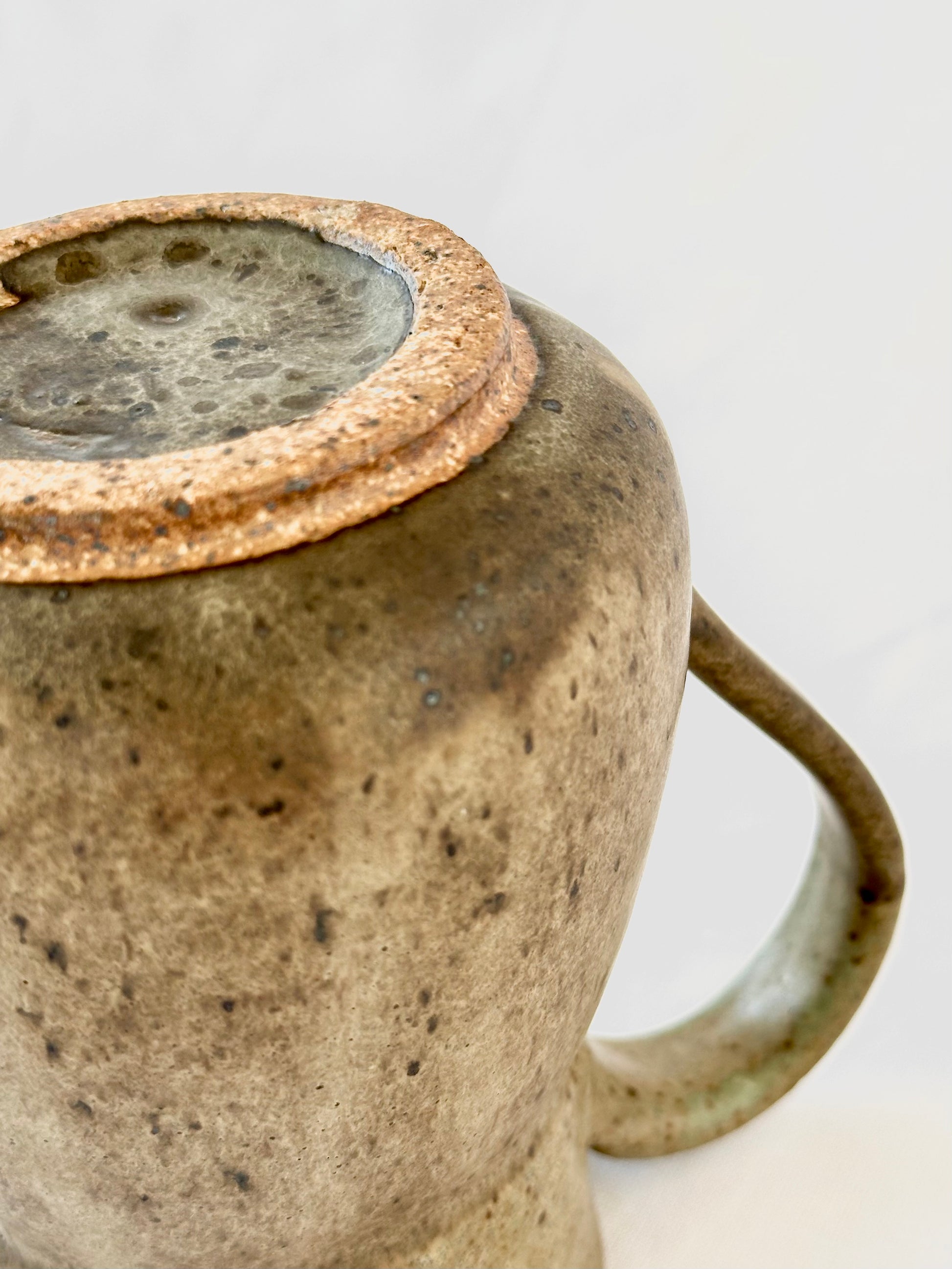 A beautiful one-of-a-kind 1960s handmade studio pottery pitcher made with fire clay and glazed with classic earthy tones. A stunning legacy handmade piece for your tabletop and barware rituals.