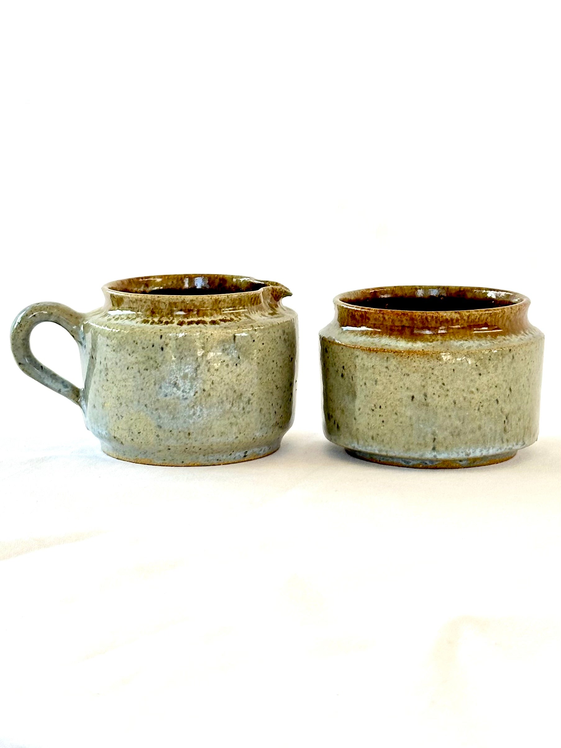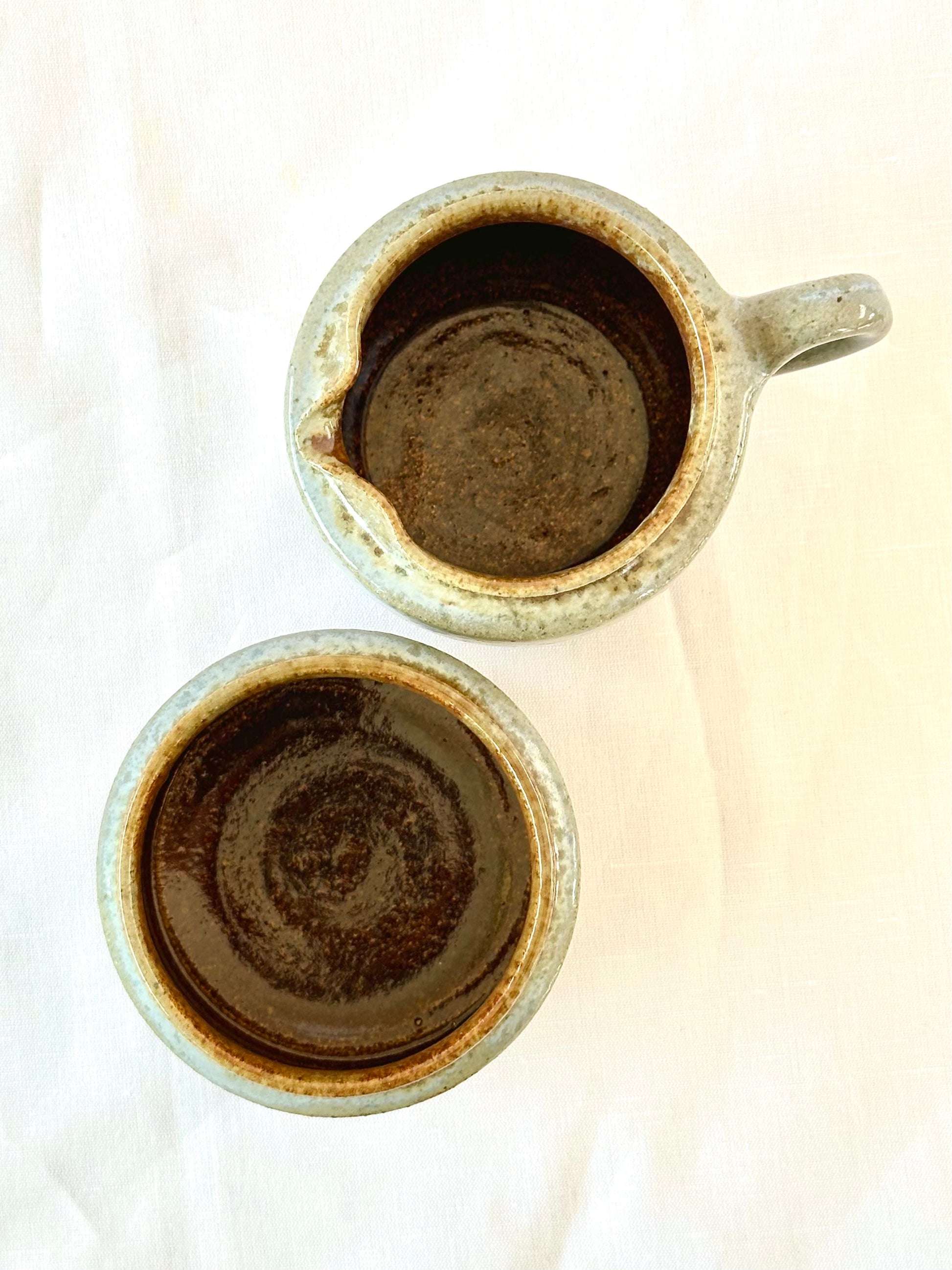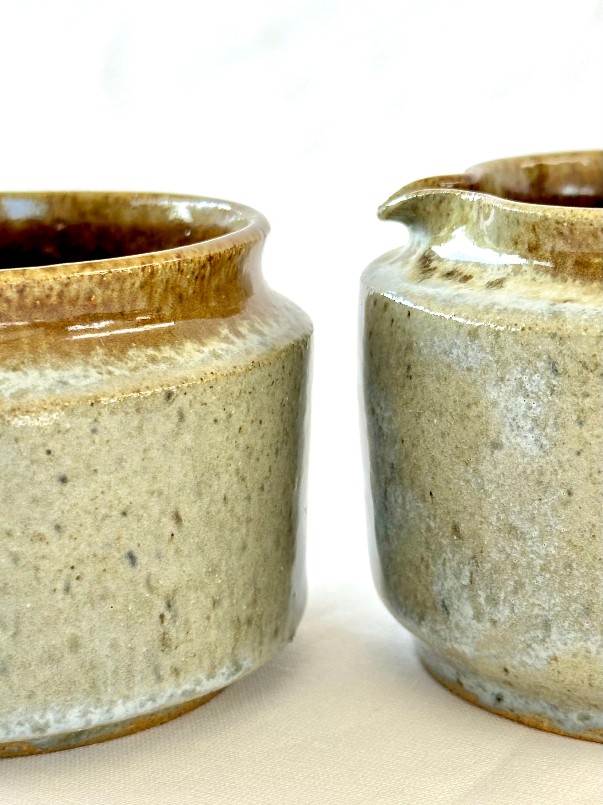A beautiful 1980s handmade pottery creamer and sugar bowl (no lid) set made from fire clay and glazed with earthy tones. Signed by Savin. Sold as a set.