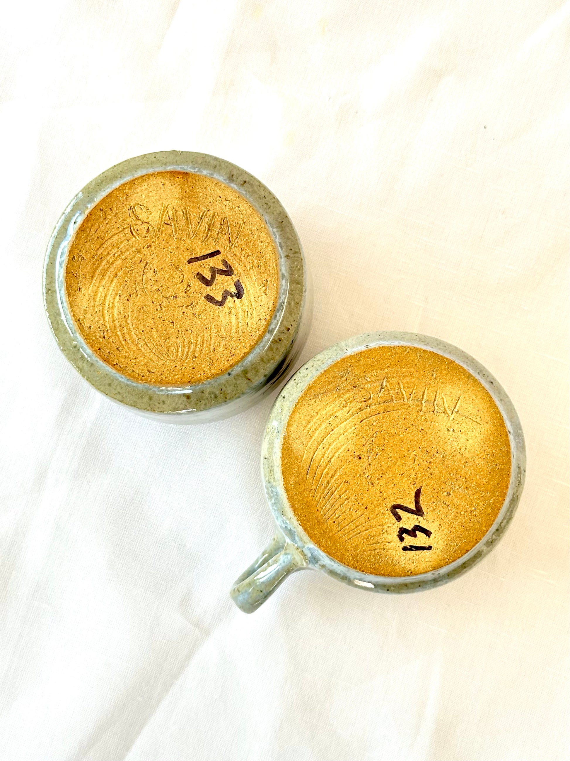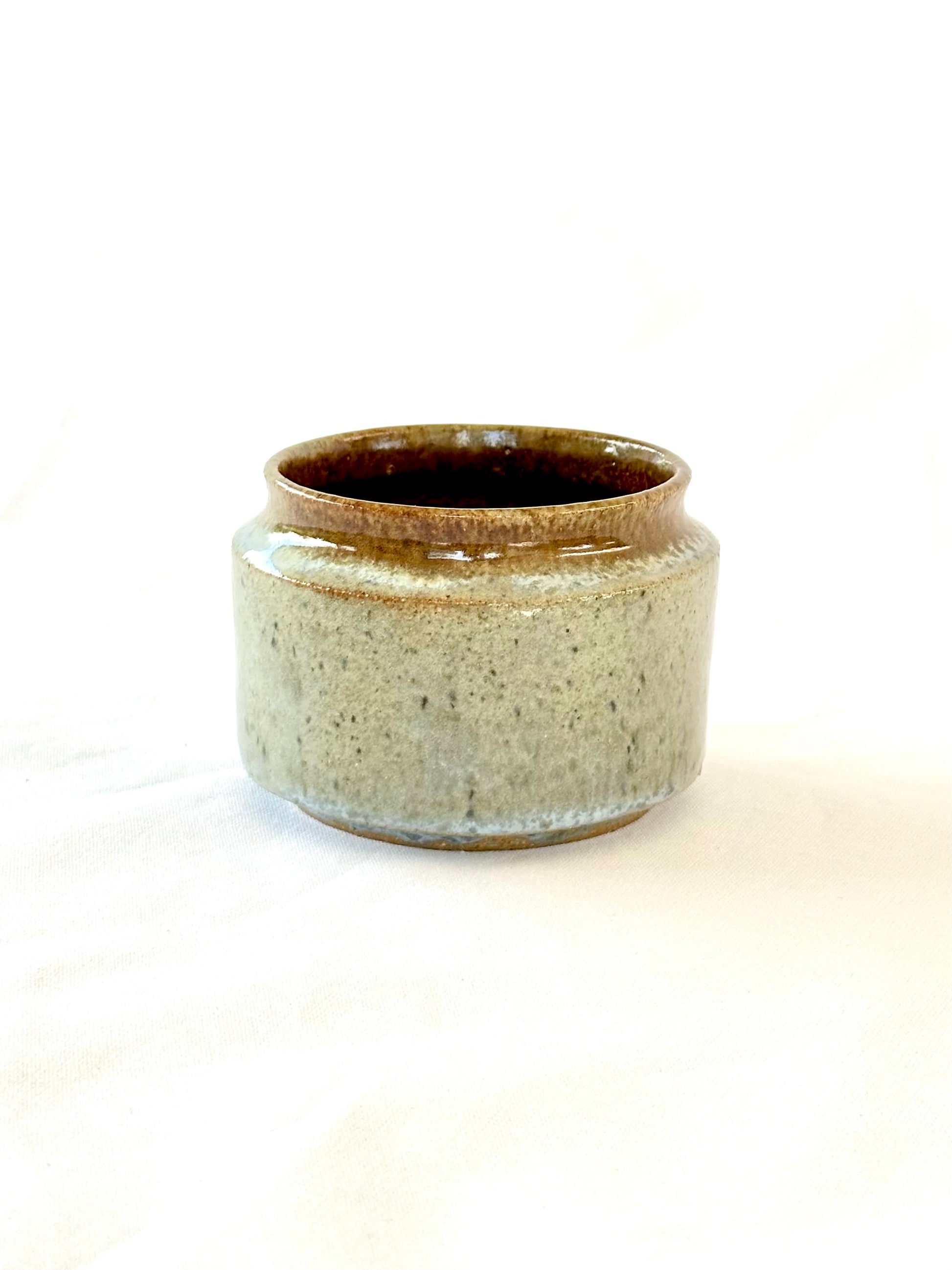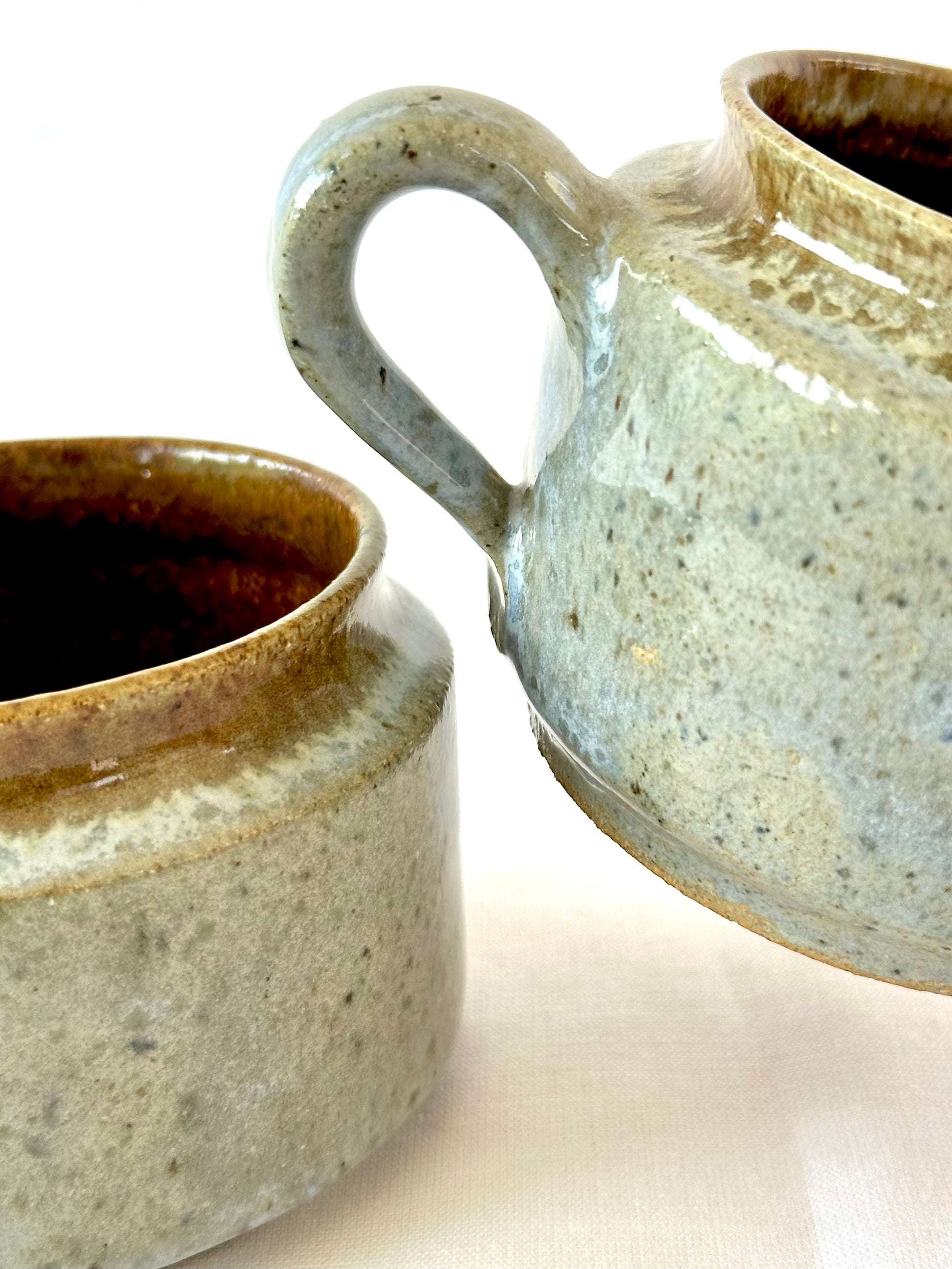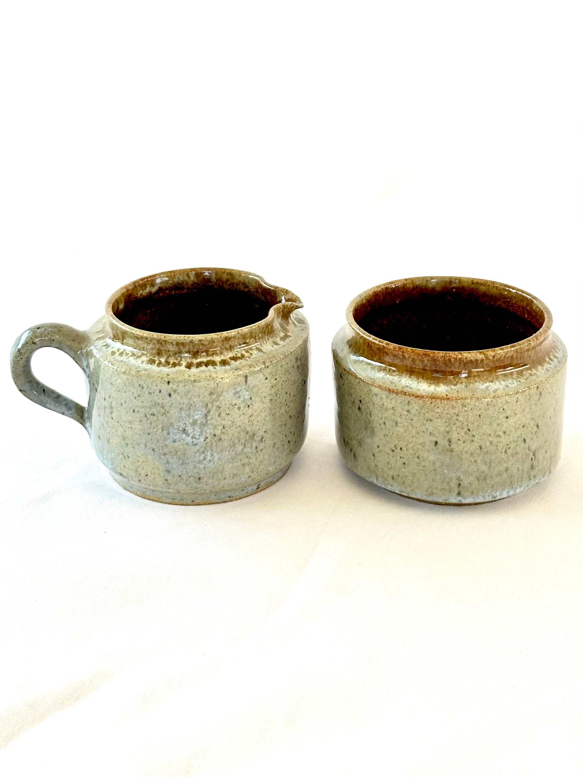 A beautiful 1980s handmade pottery creamer and sugar bowl (no lid) set made from fire clay and glazed with earthy tones. Signed by Savin. Sold as a set.