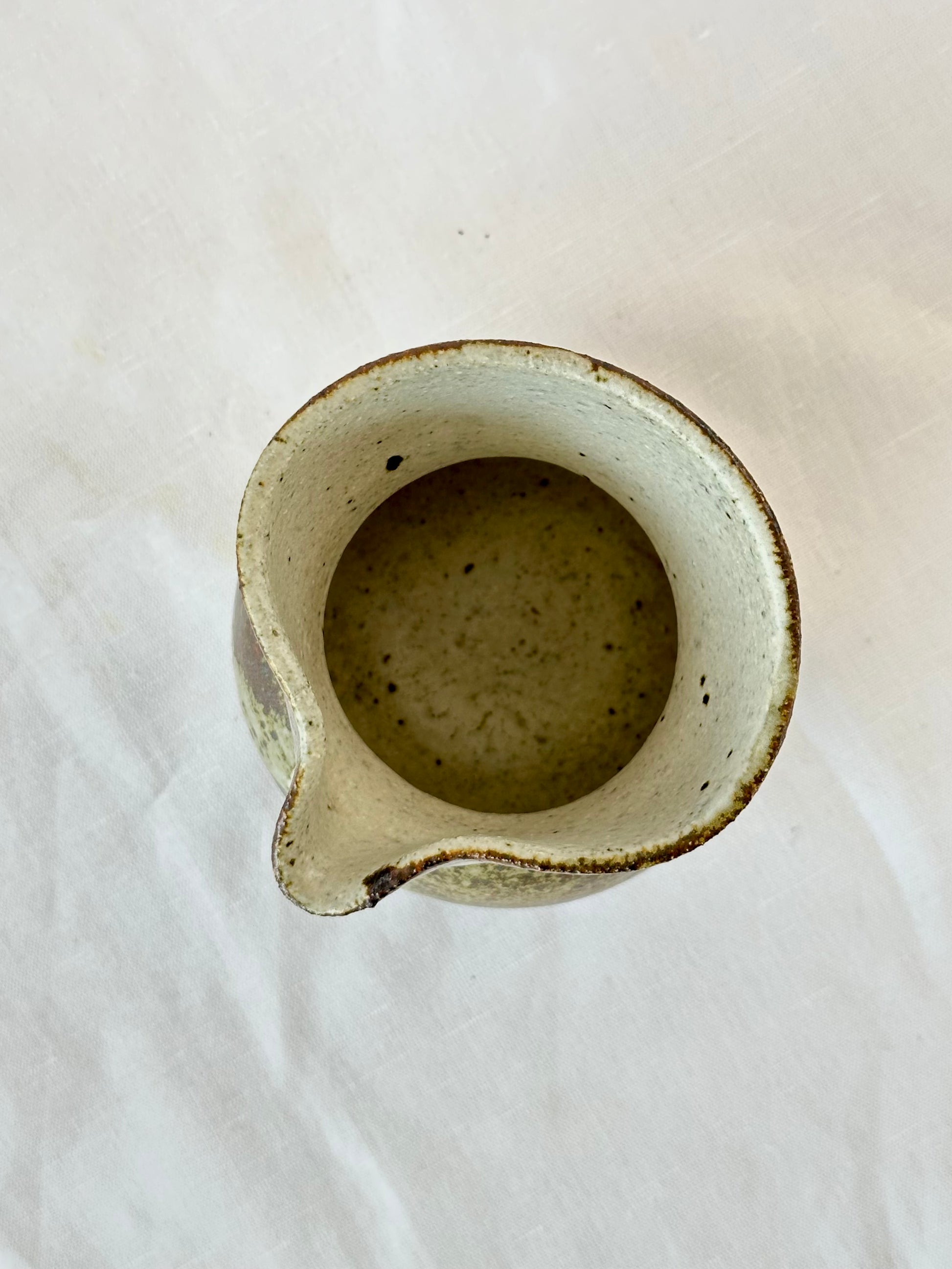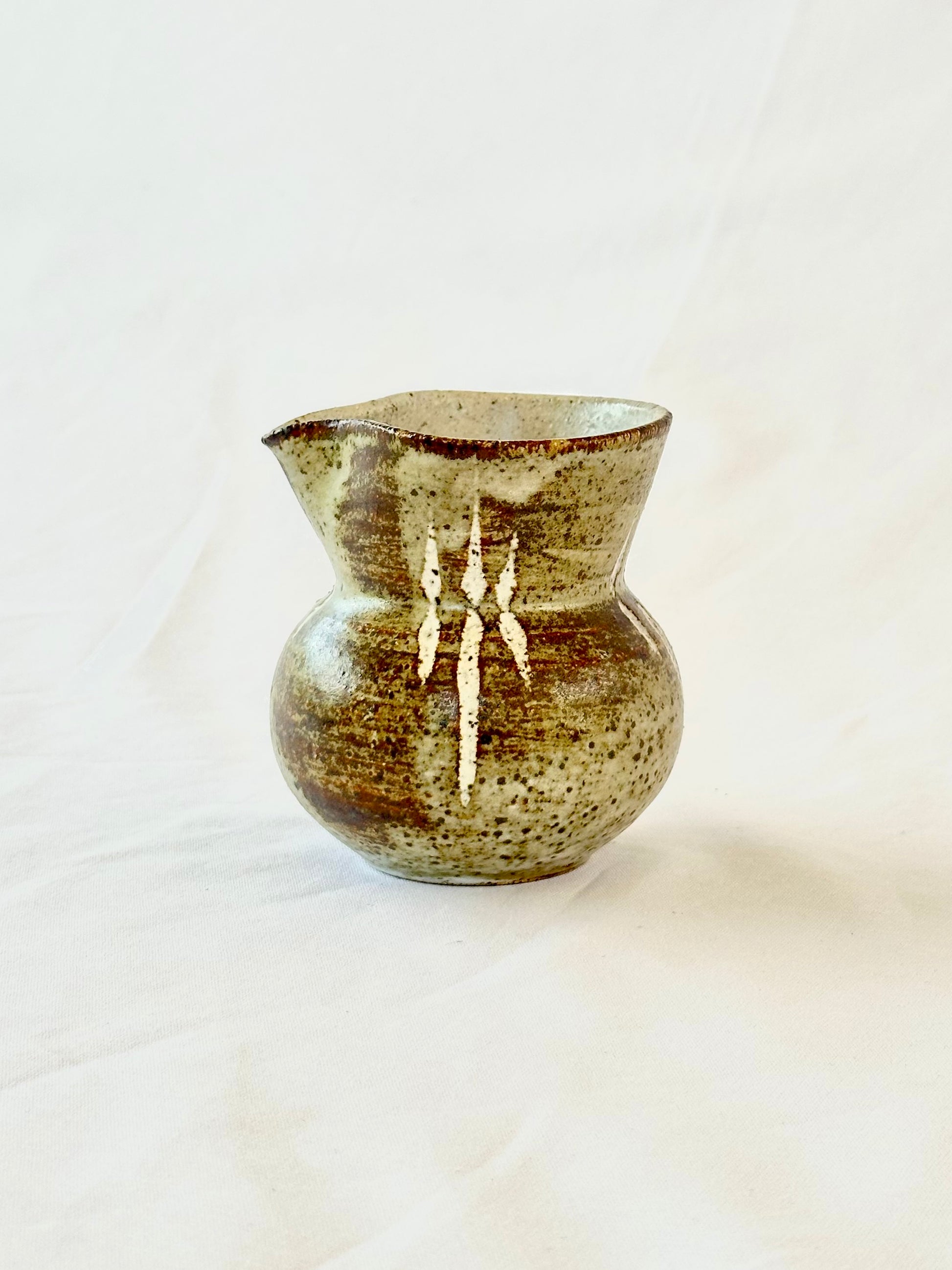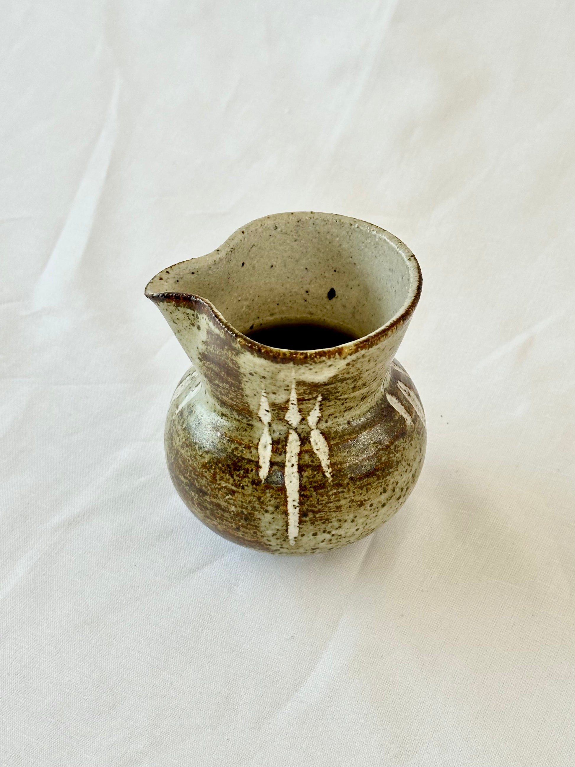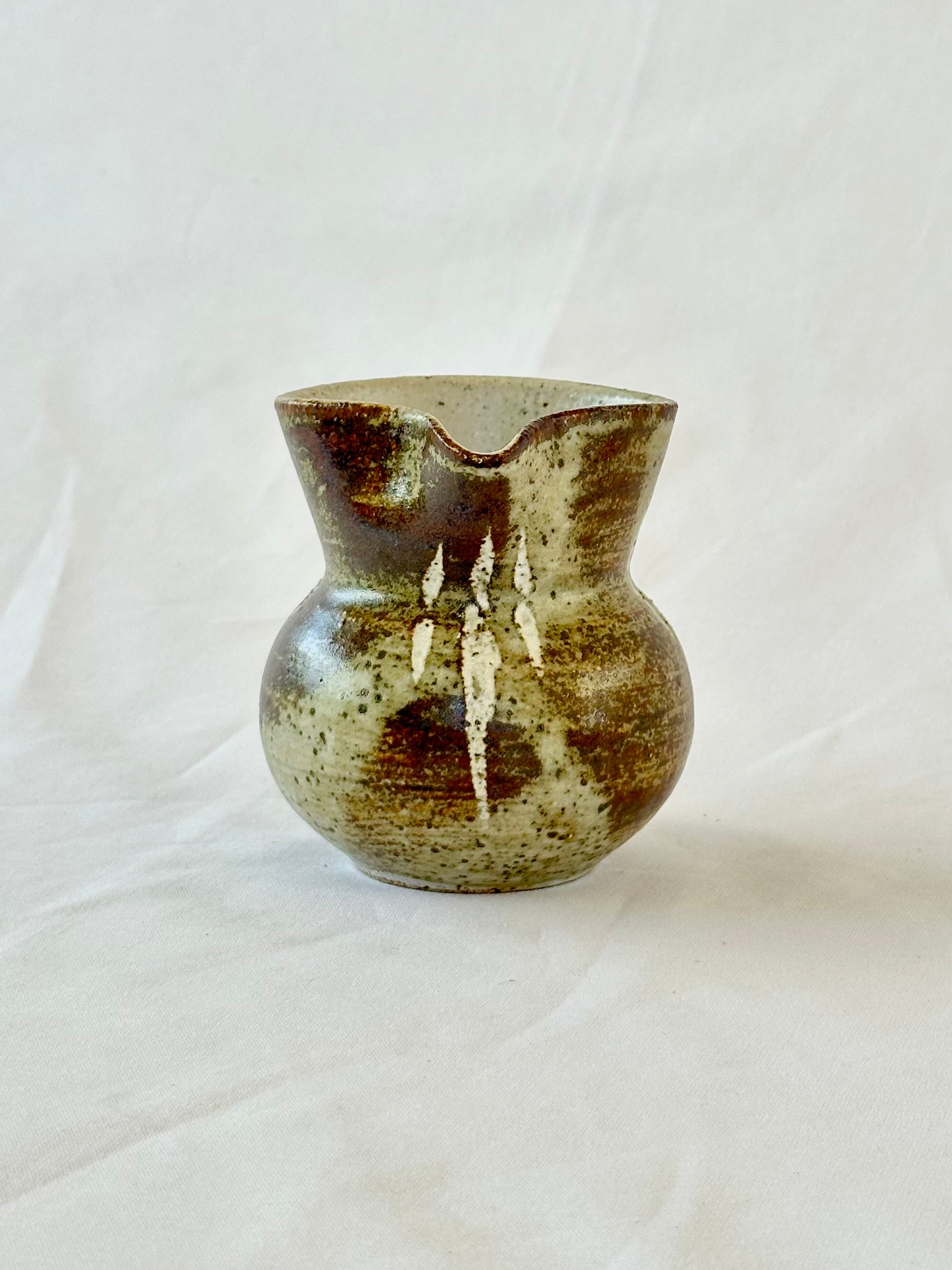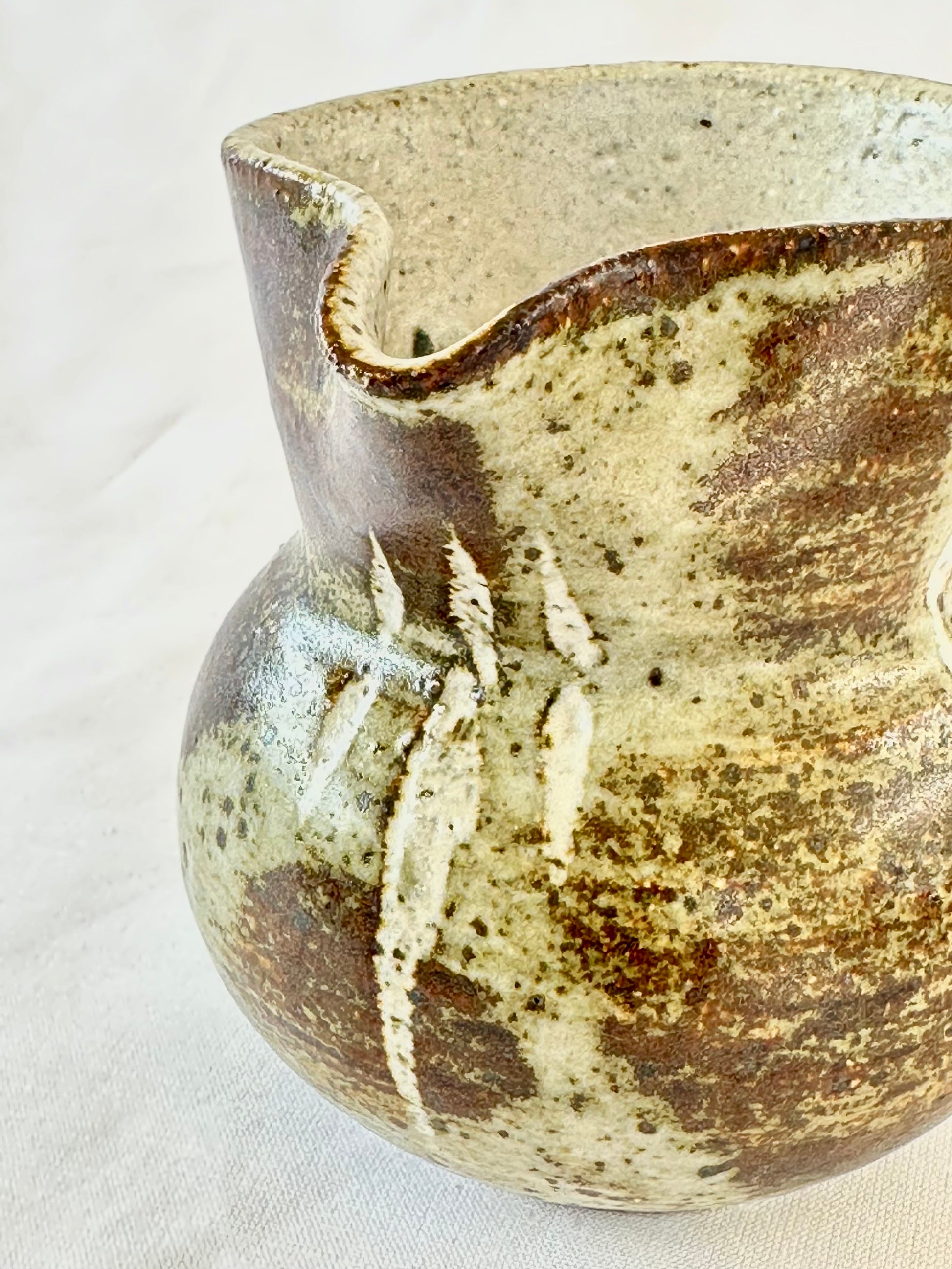 A beautiful one-of-a-kind 1980s handmade pottery pitcher made with stoneware clay and glazed with classic earthy tones. A stunning legacy handmade piece for your tabletop and barware rituals.