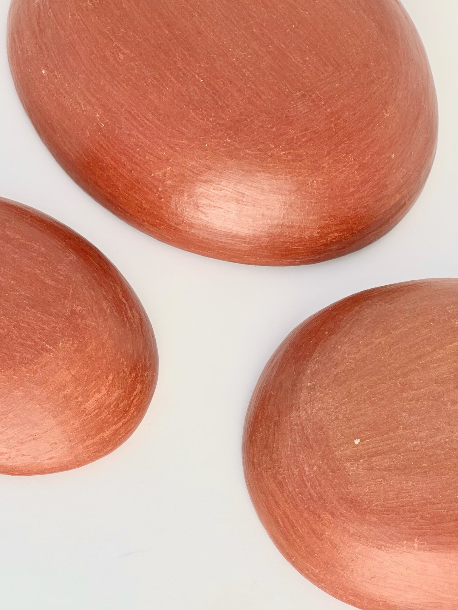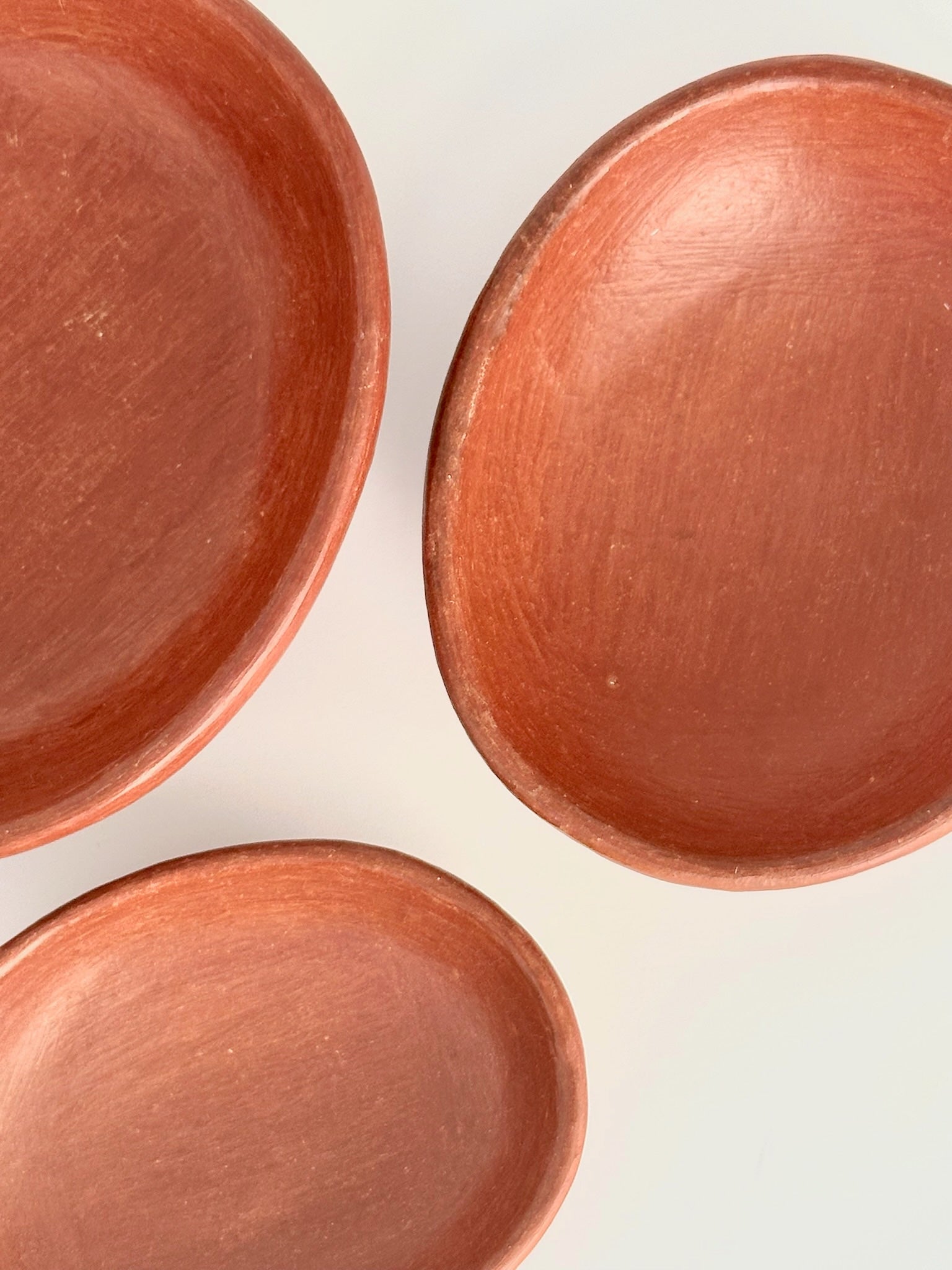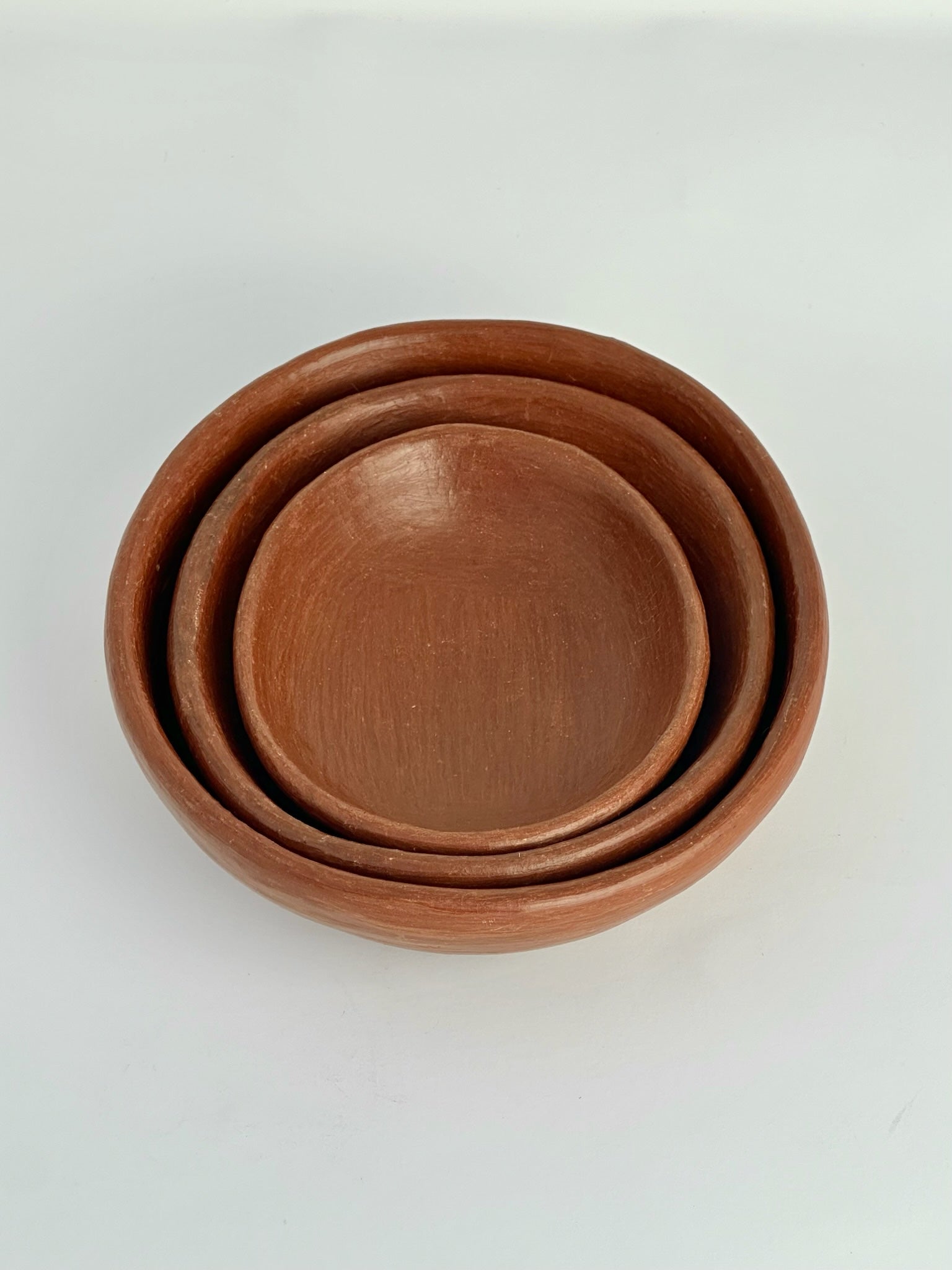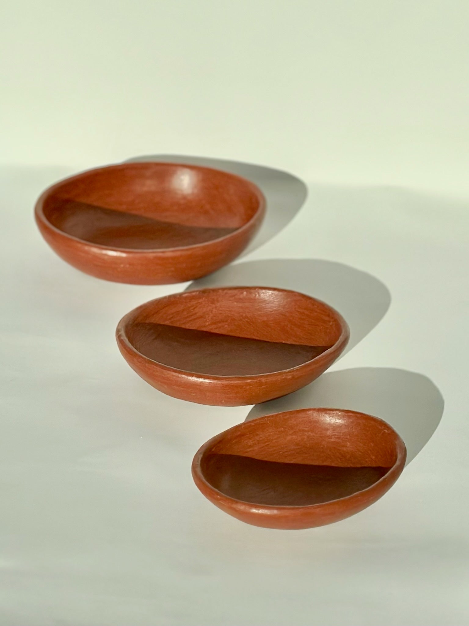 Set of three oval nesting bowls, made by hand in San Marcos Tlapazola in Oaxaca from natural food safe barro rojo clay. Great for salt and spices on your table or cooking area and for serving salsa and banchan. The lovely, sienna tone of the clay is warm and rich.