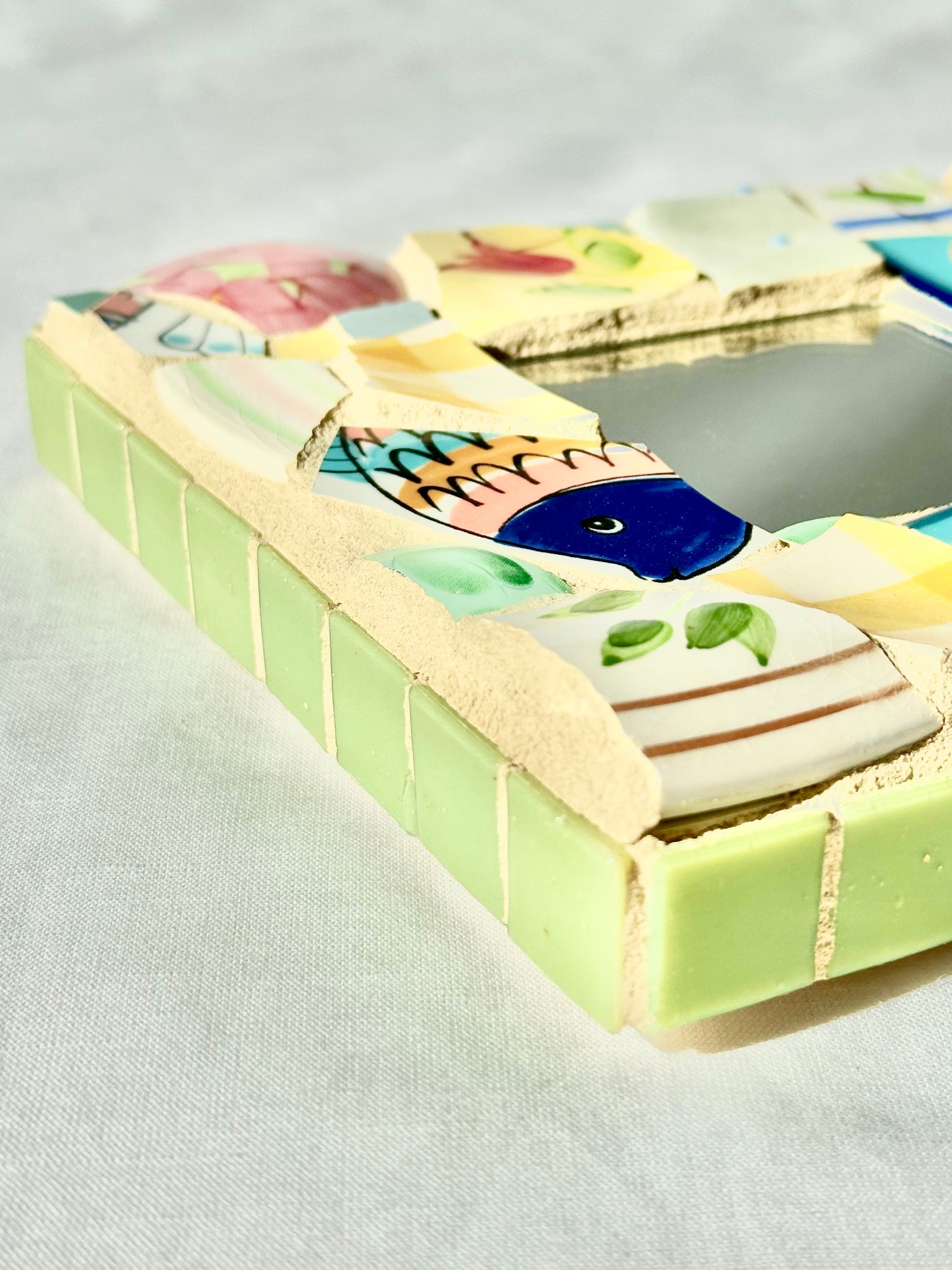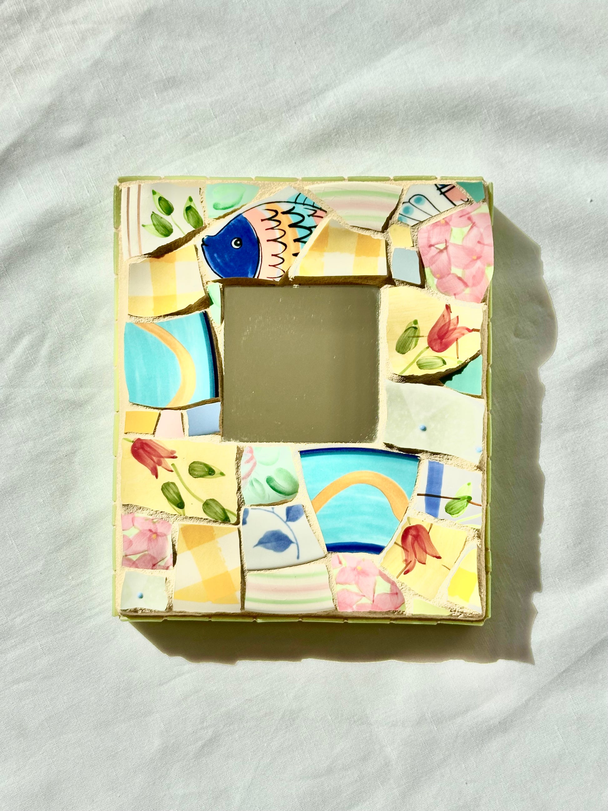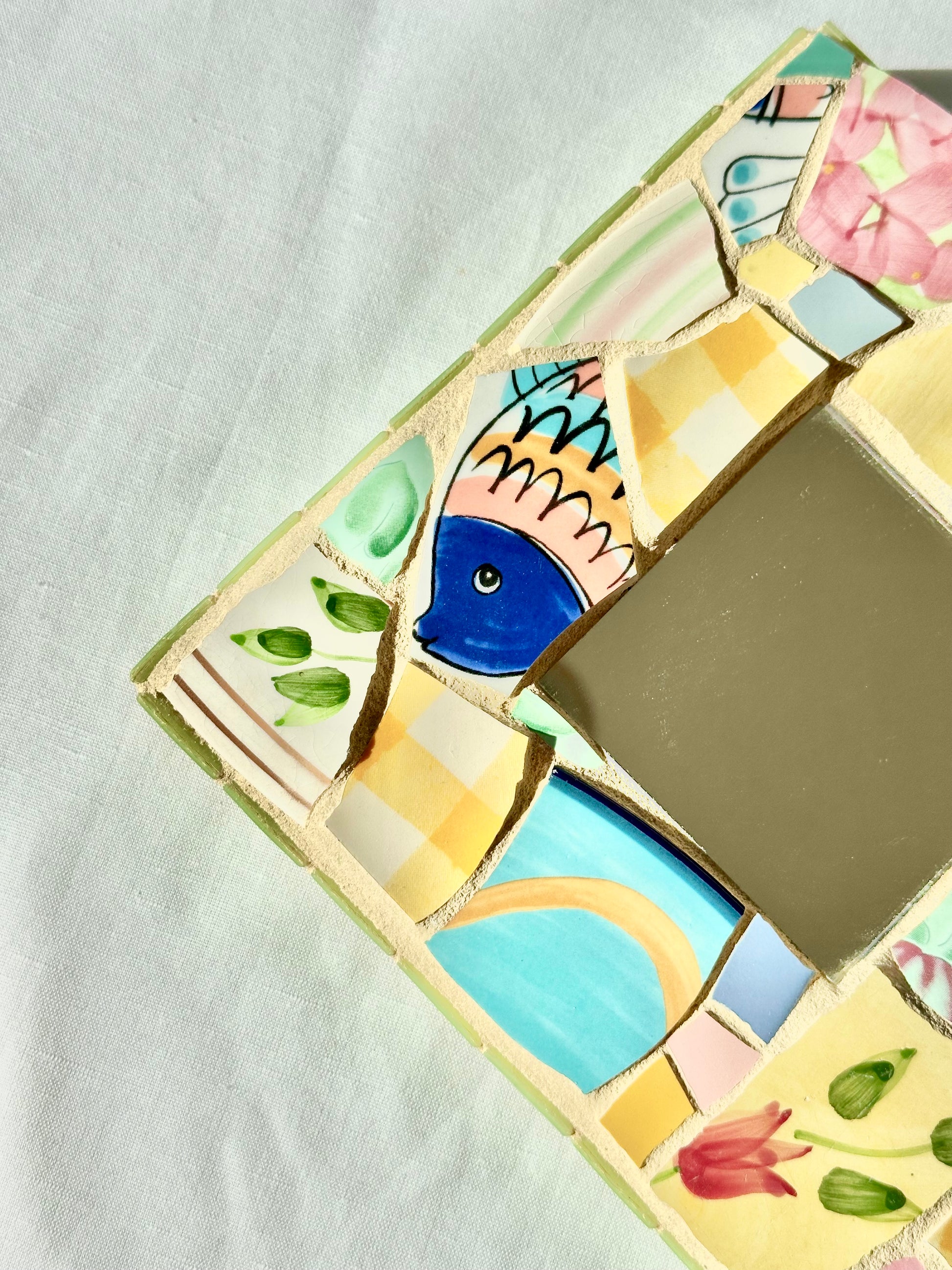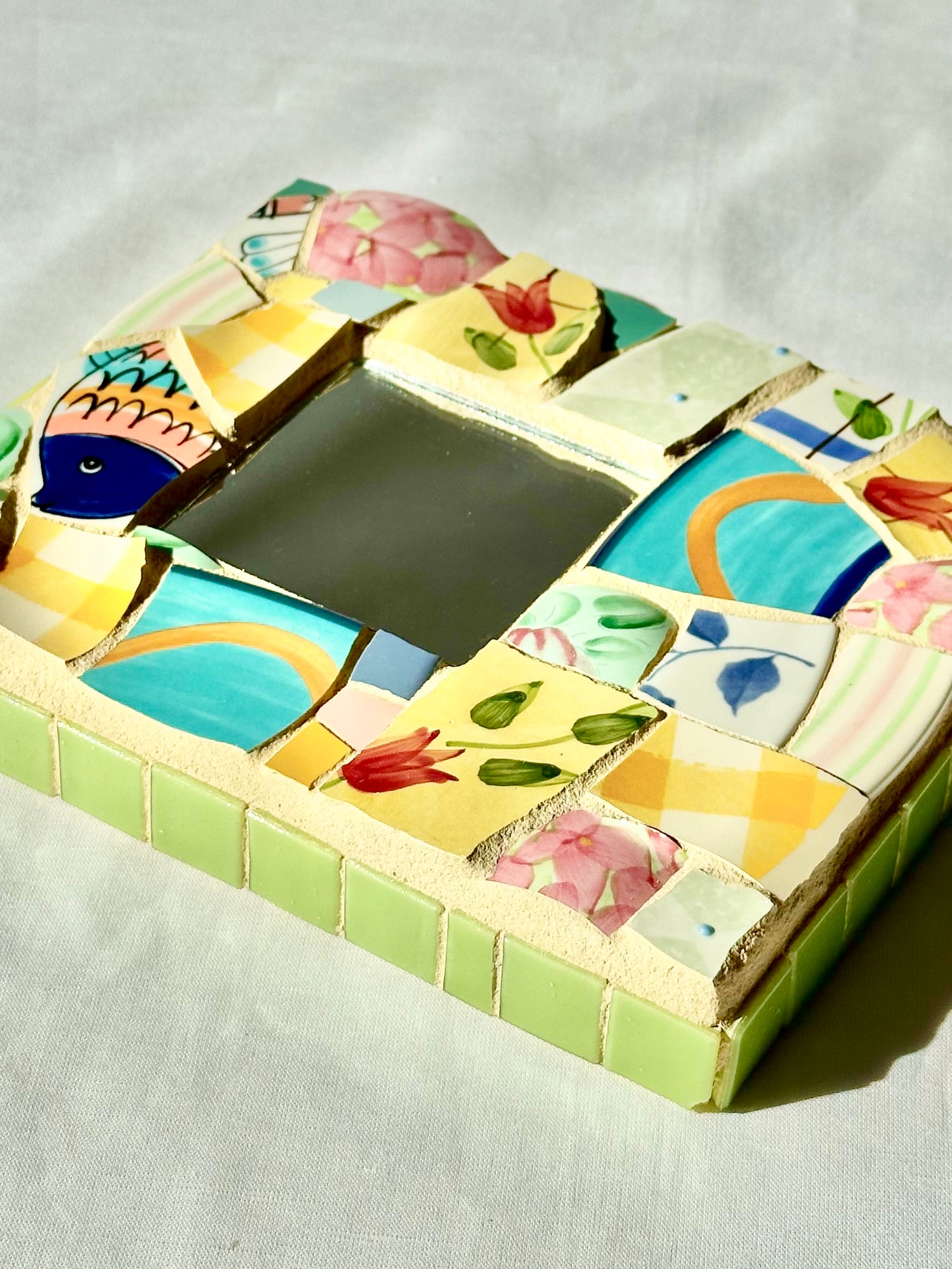 Beautiful mosaic art mirror from mosaic and jewelry artist Lisa Betz.