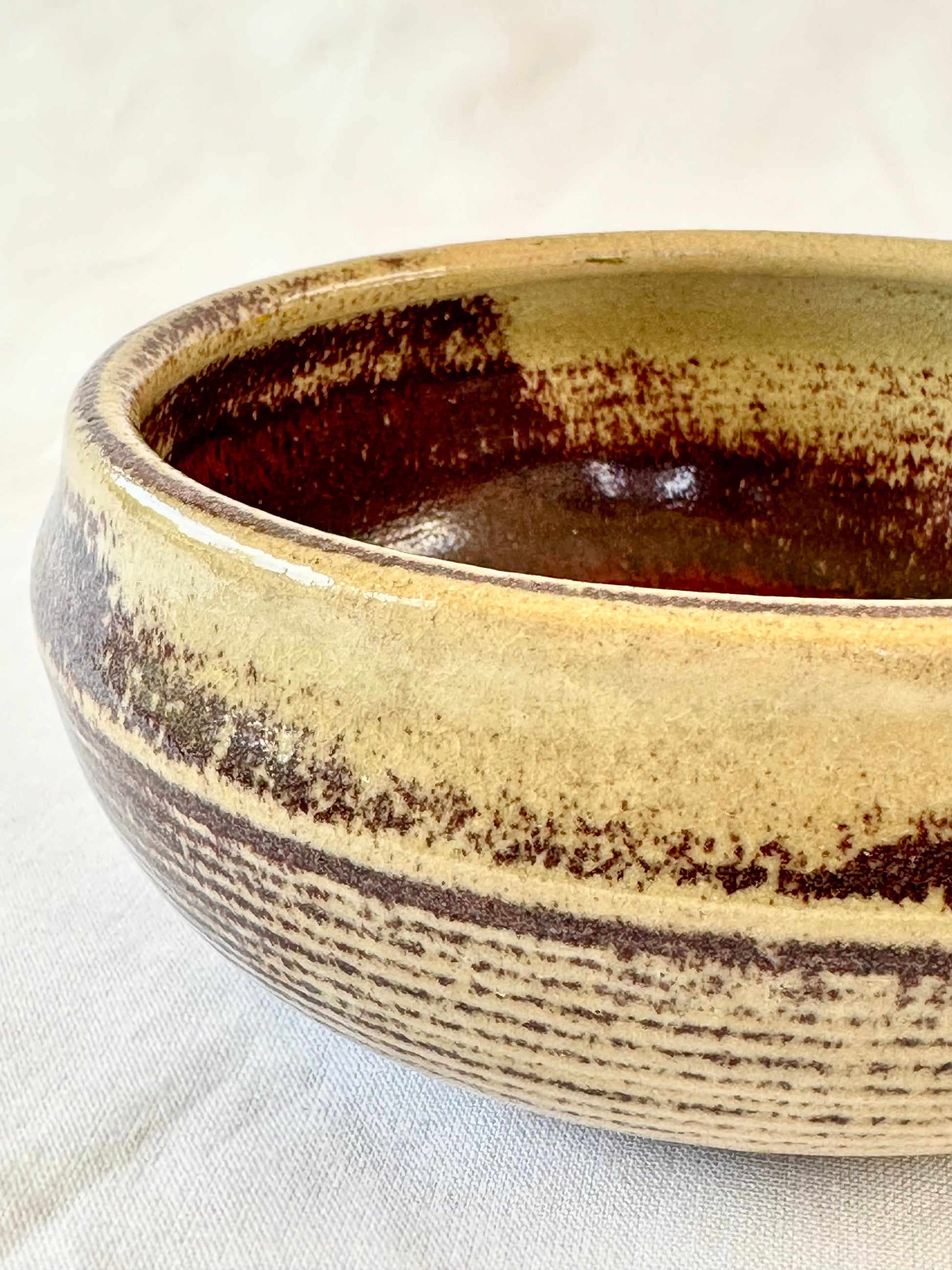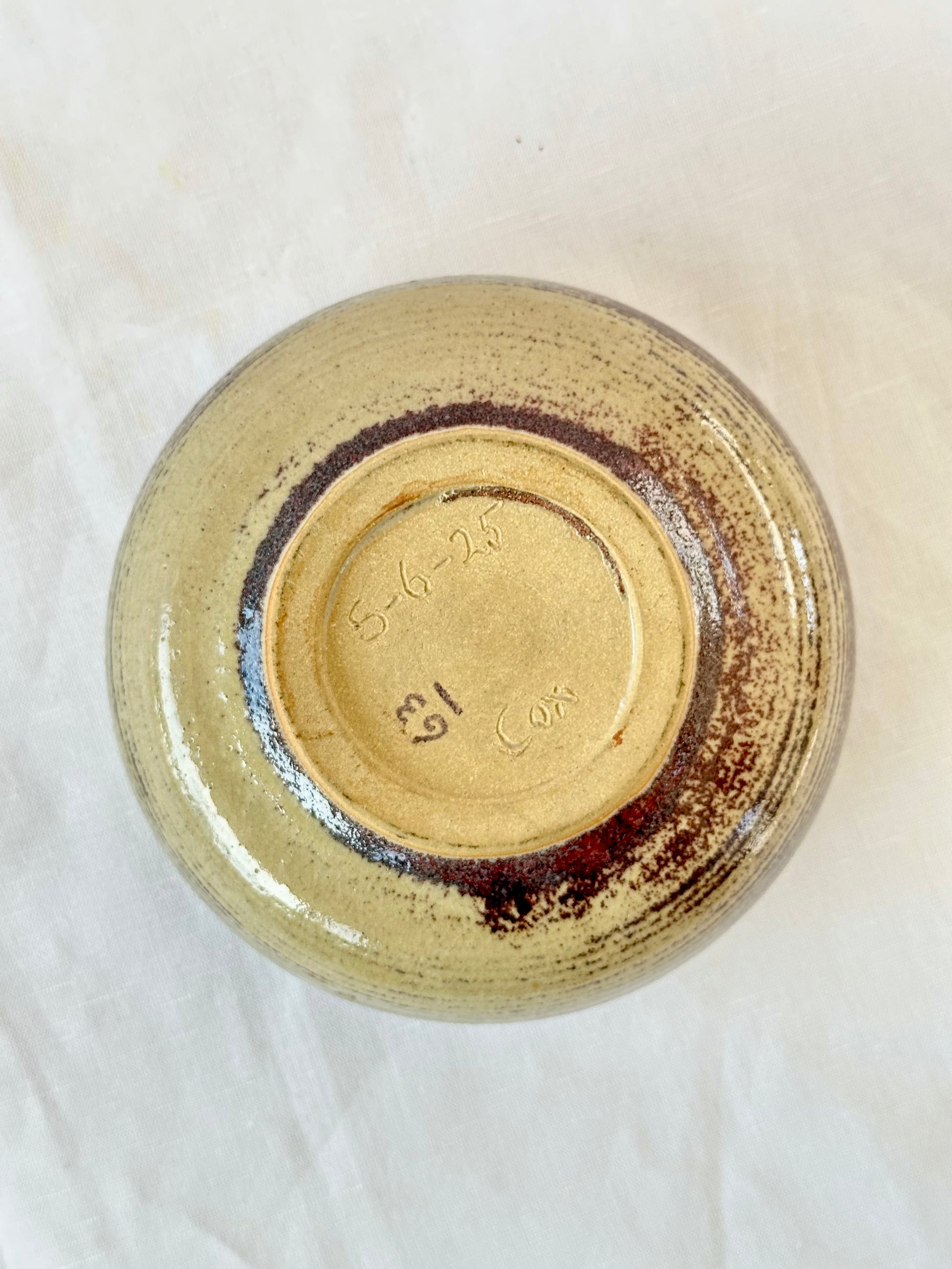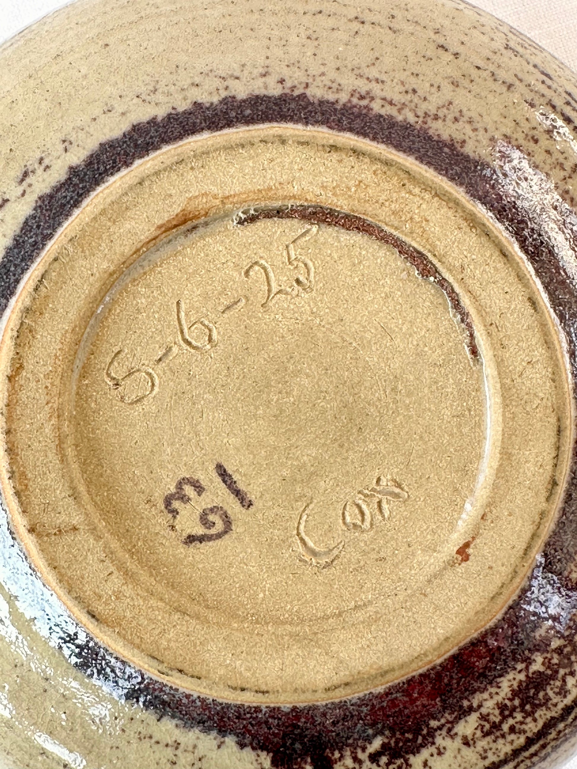 A lovely one-of-a-kind 1925 handmade ceramic pottery bowl glazed with earthy tones signed by Cox.