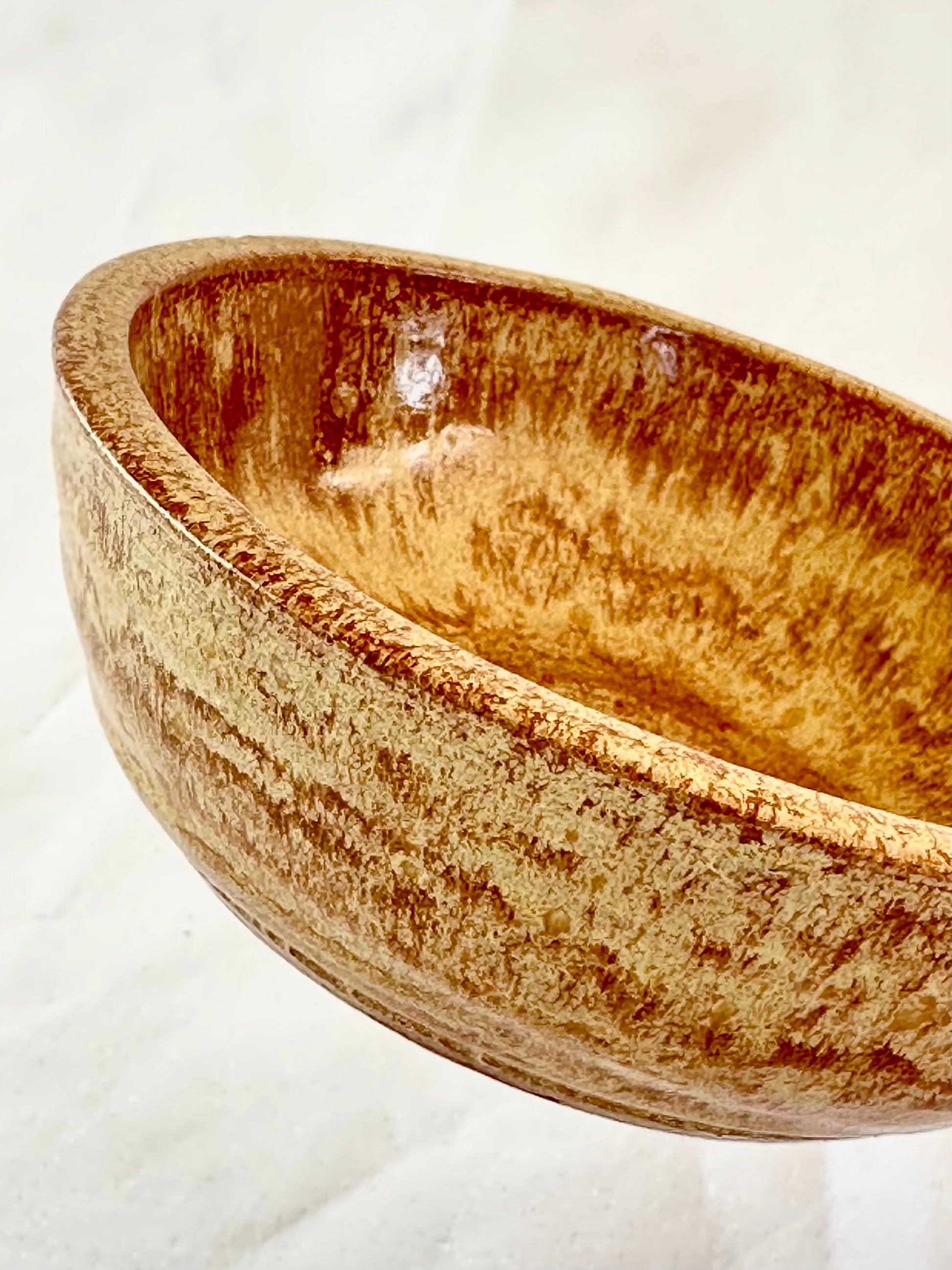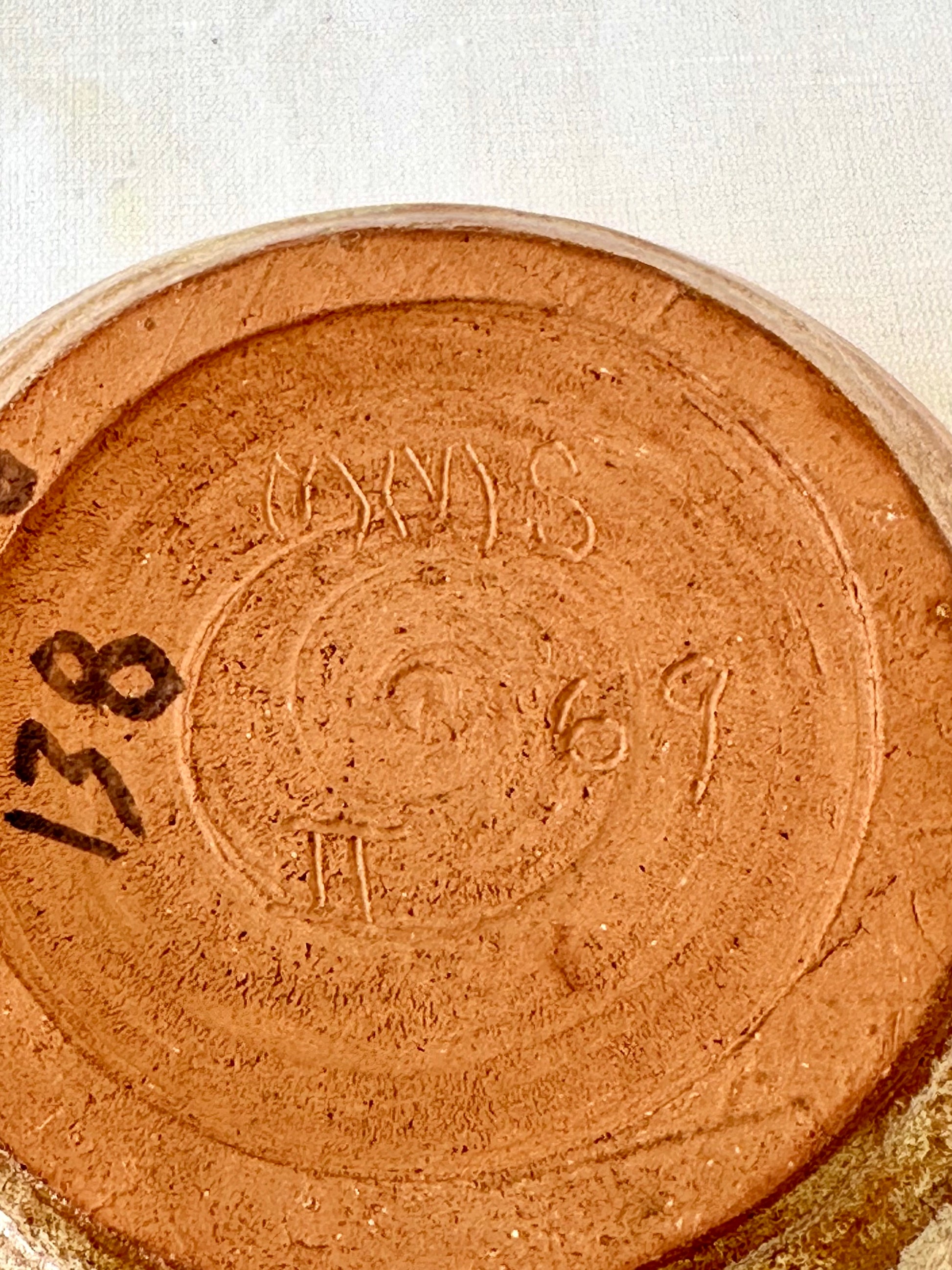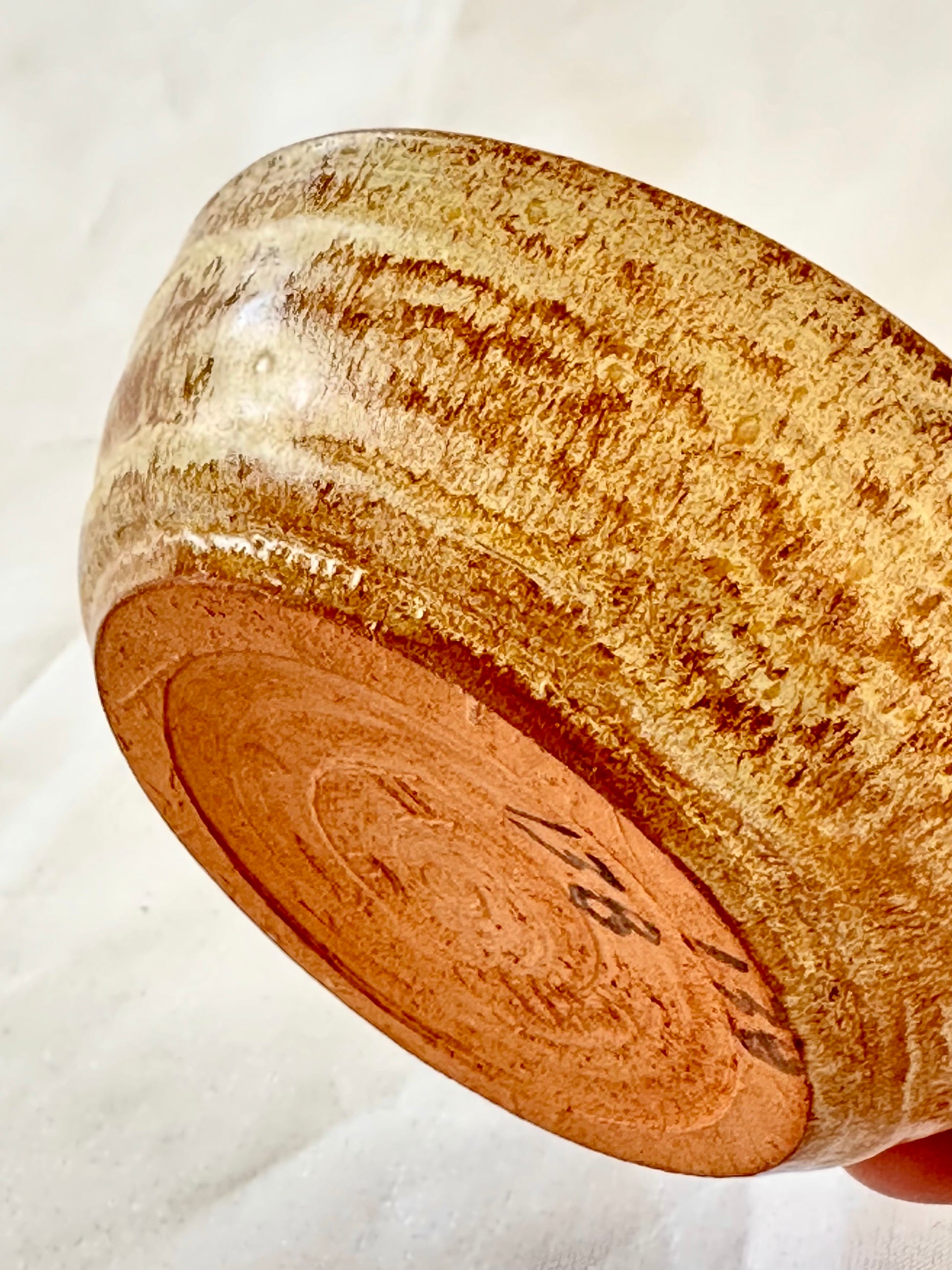 A lovely handmade earthenware pottery bowl glazed with earthy tones from 1969 signed MMS.