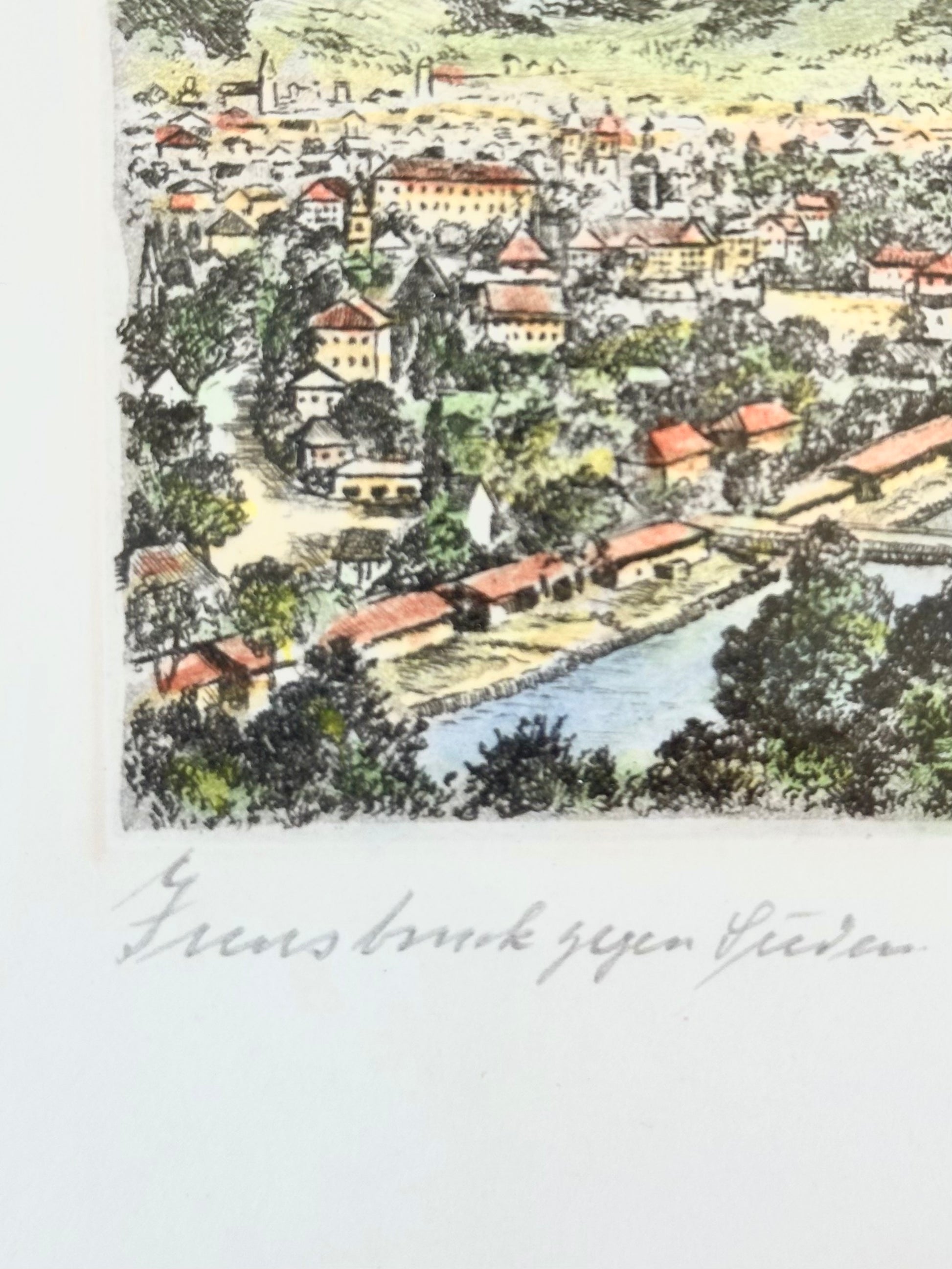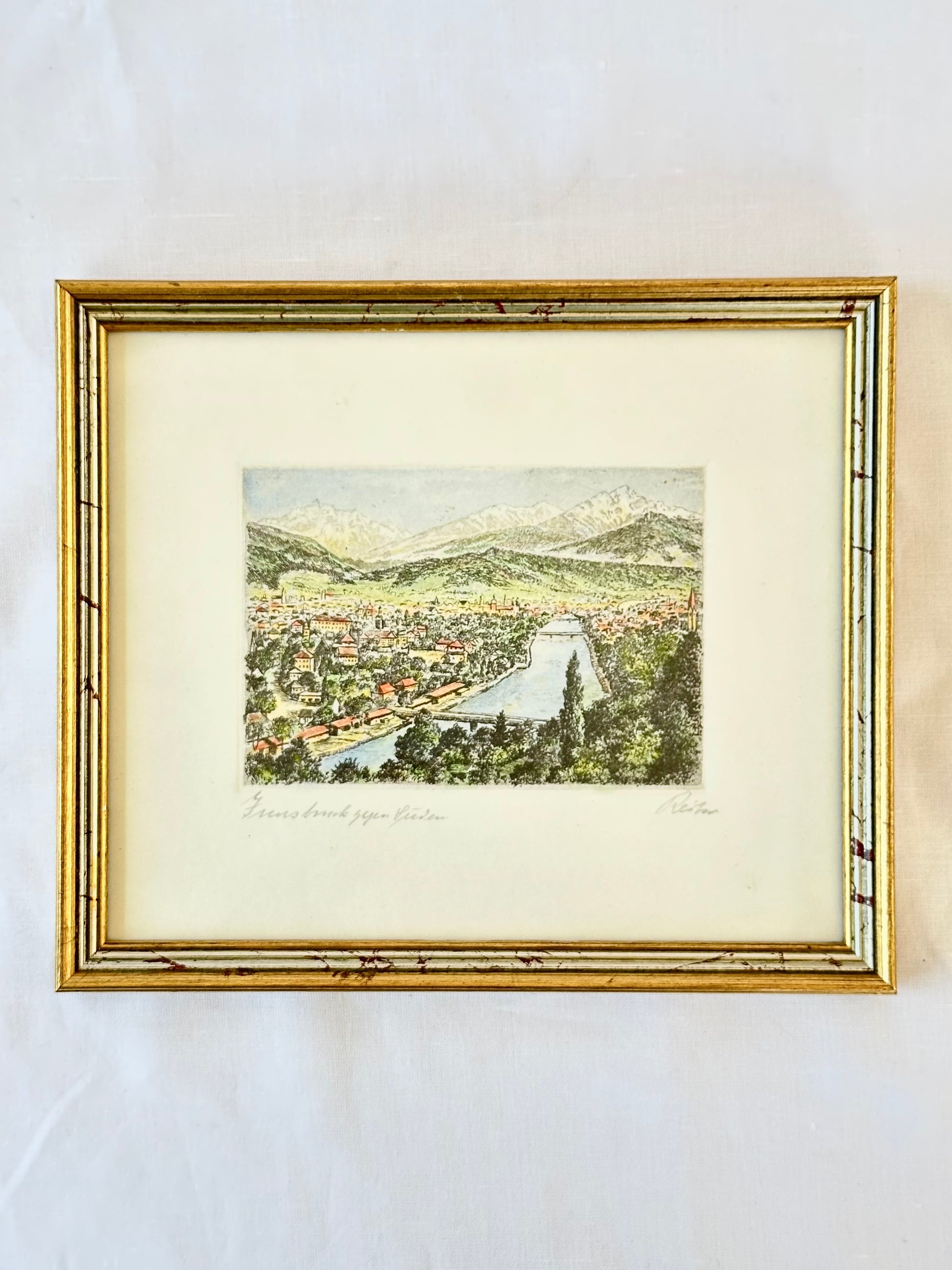 A hand pulled signed original lithograph of Innsbruck Gegen Suden viaduct in Austria. The majestic Patscherkofel mountain serves as the perfect backdrop to the charming city of Innsbruck. The snow-capped peaks, lush green valleys, and the iconic architecture of Innsbruck blend harmoniously, creating a truly mesmerizing scene that will leave you in awe.